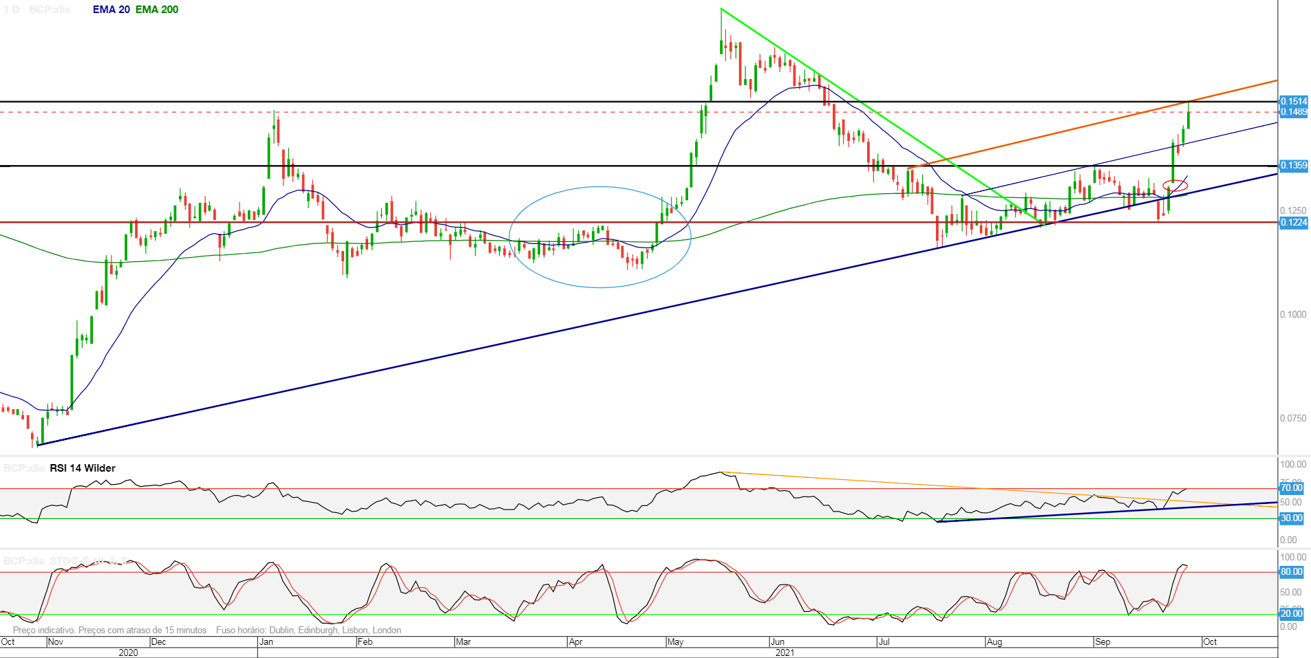 Na minha opinião, este movimento do BCP ainda tem muito mais para andar. O target que aponto para as próximas 5 a 10 sessões é um pouco para cima do movimento do meio de maio, isto é, um pouco acima dos 0,17.