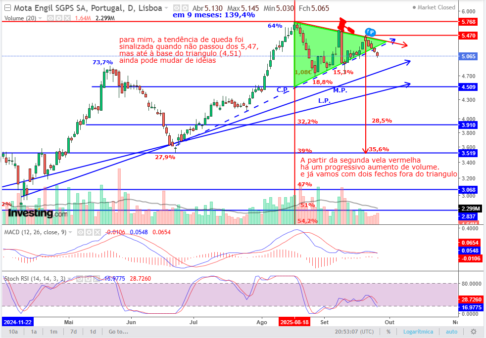 Nesse meu post parecia que a Mota ia disparar e fazer uma "handle" minúscula de um "cup" gigante (o que achei estranho). O facto da cotação ter caído novamente só ajudou a formar uma "handle" mais consistente (que poderá estar prestes a completar a sua formação).