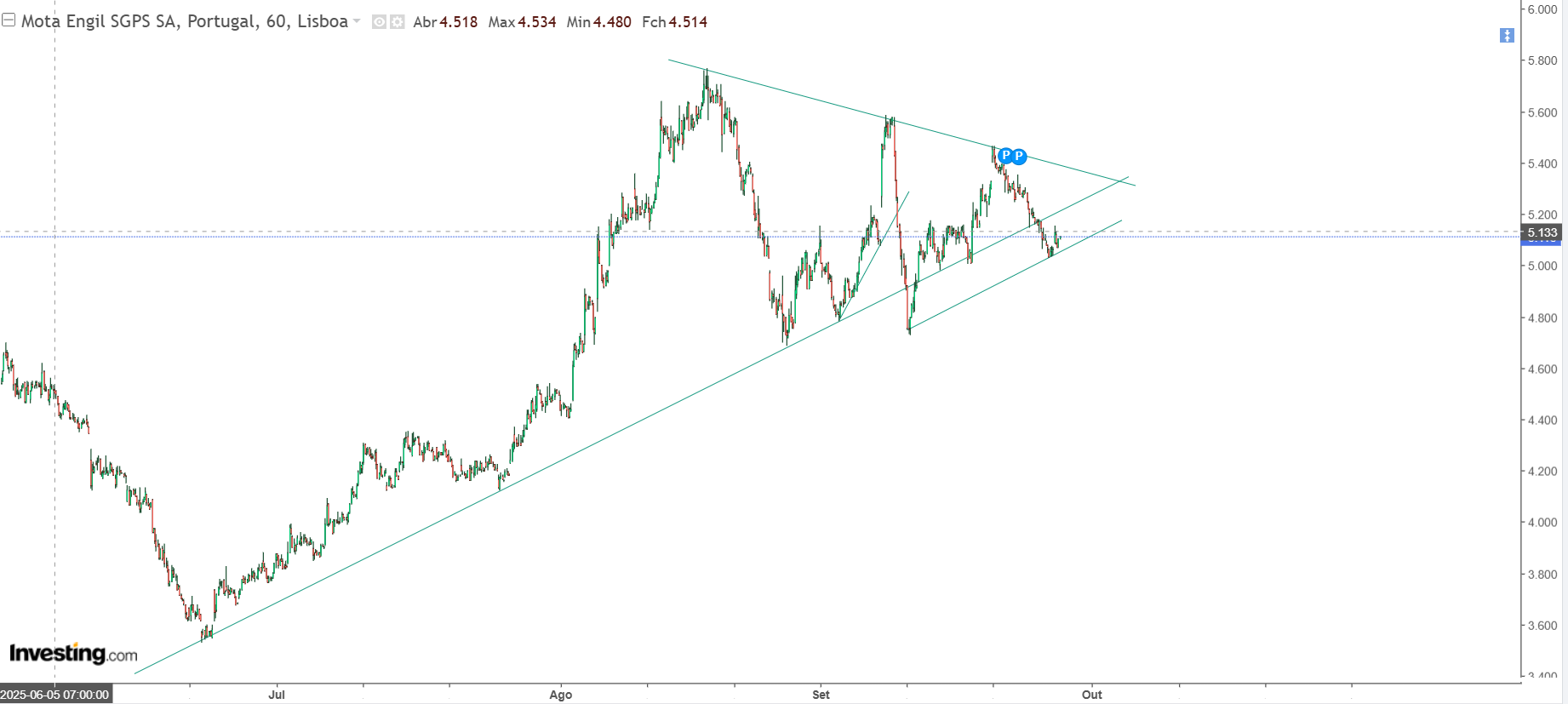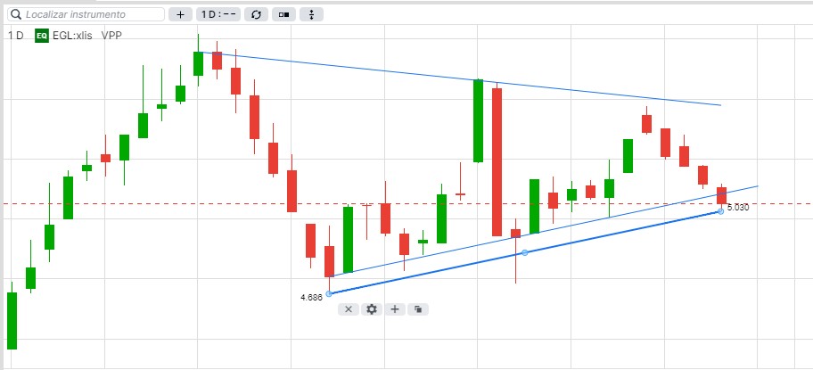 Conjugando a análise fundamental com a técnica, diria que este padrão tem uma alta probabilidade de ter o esperado breakout, com uma projeção acima do price target dos 6,20€.