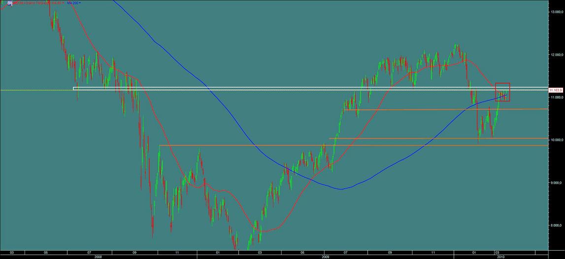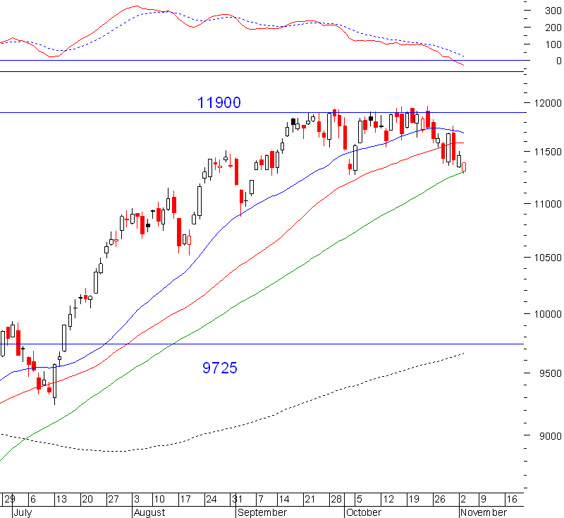 A subida do índice tem vindo a ser suportada por uma LTA bastante inclinada, que dificilmente aguentará por muito mais tempo. O índice tem uma pequena zona de suporte nos 11400 e outra nos 11000. Em caso de acontecer uma correcção maior, o valor de referência a ter em conta são os 9725.