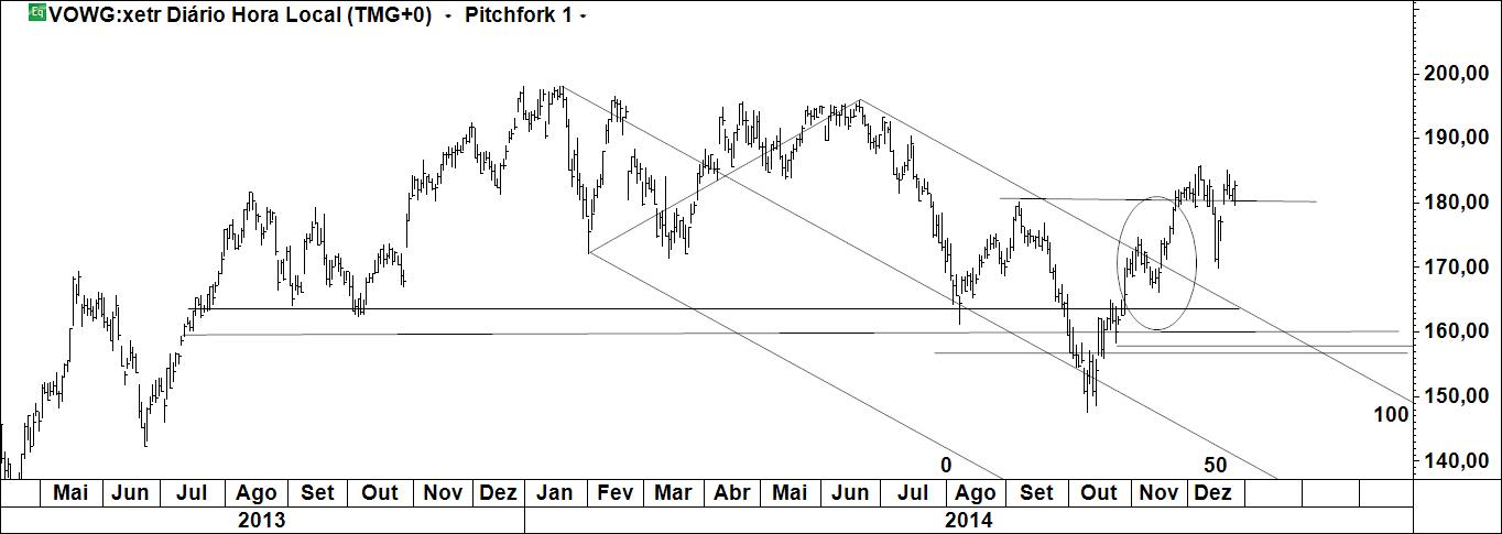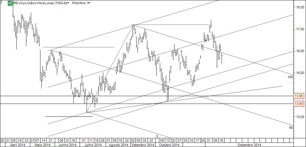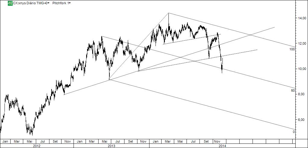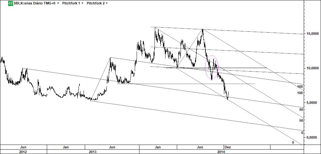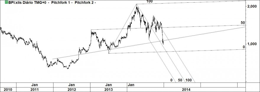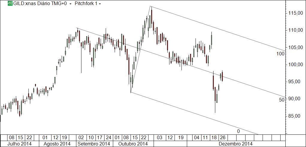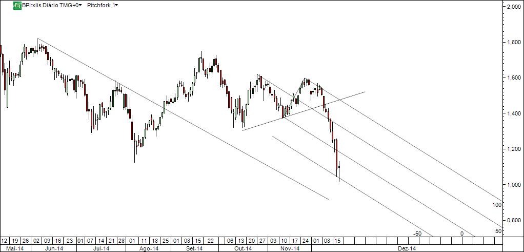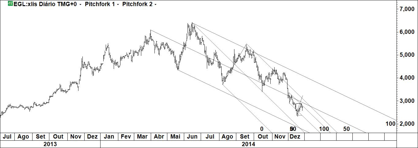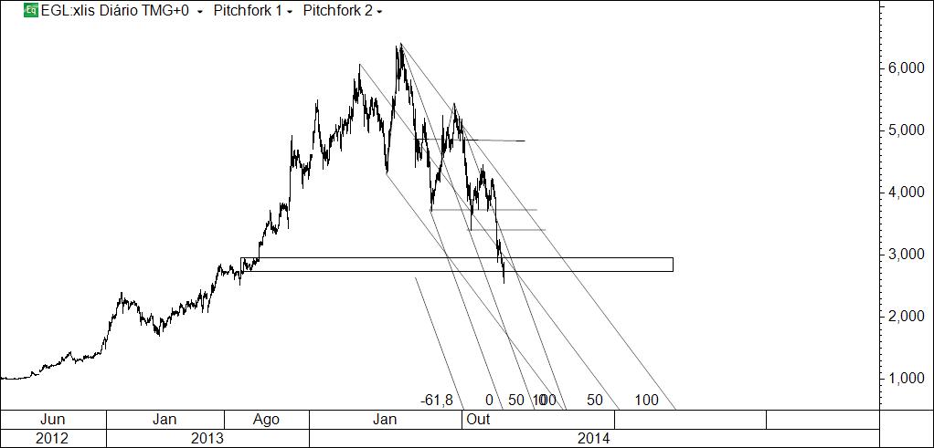 As linhas azuis são as que neste gráfico representam a Center Median Line (ML) e respectivas paralelas superior e inferior (MLH). Tentei desenvolver um fork tradicional ou modificado, que encaixasse o melhor possível nos movimentos que o preço fez. Talvez por minha incapacidade e por se tratar de um titulo com bastante volatilidade não o tenha sido bem conseguido.