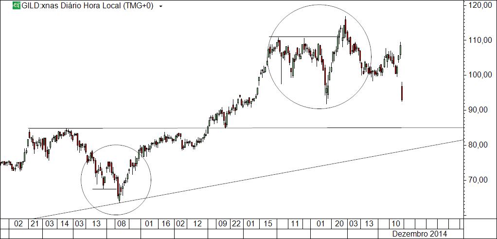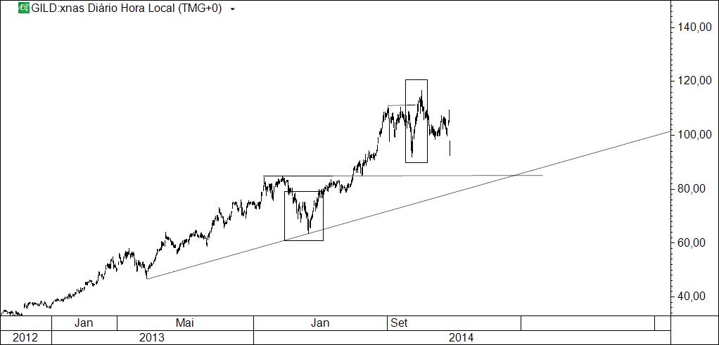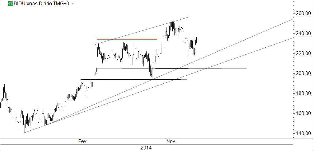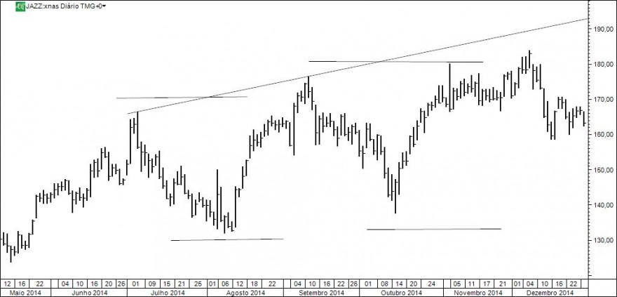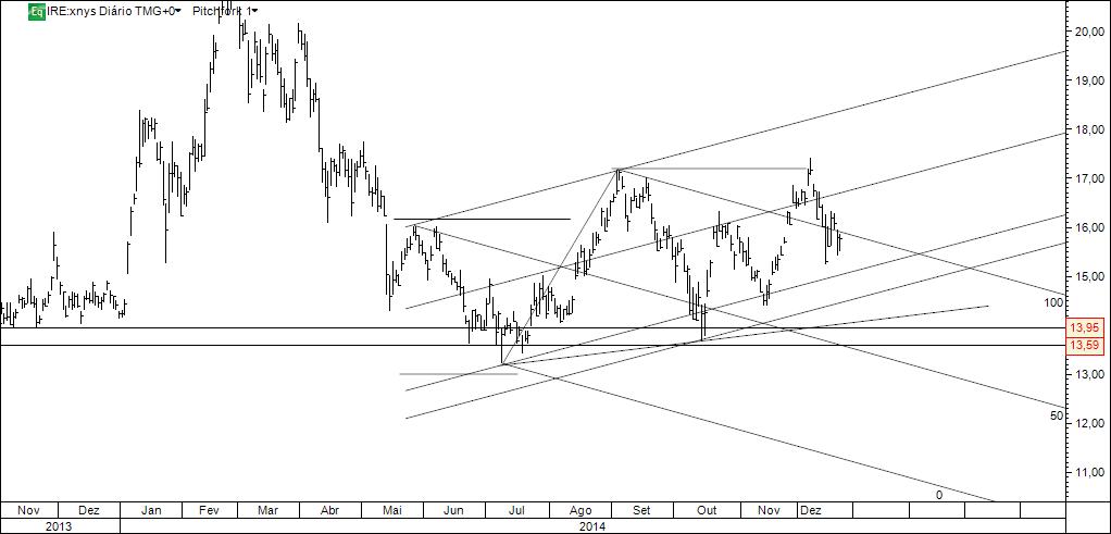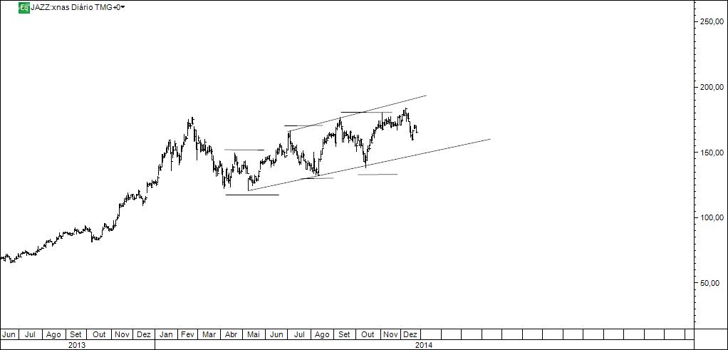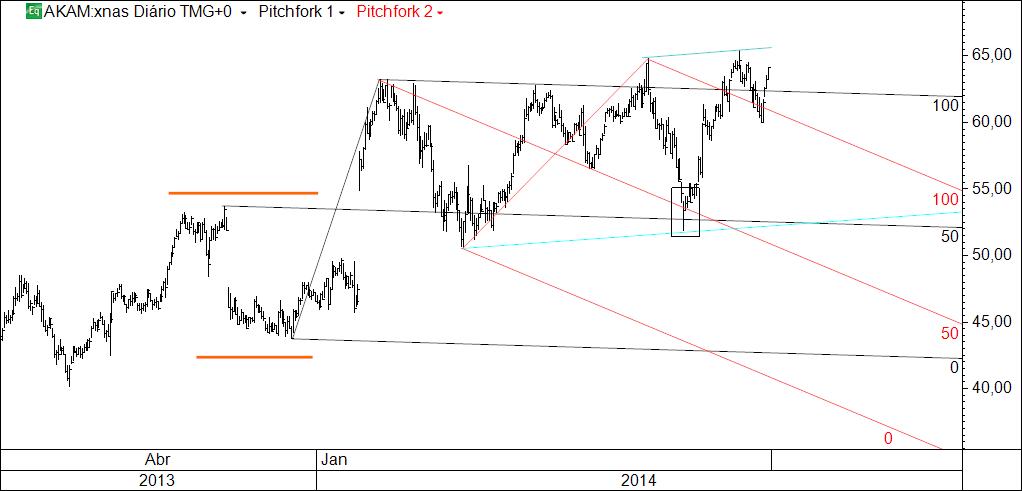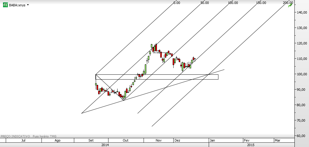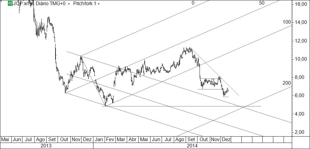 As linhas azuis são as que neste gráfico representam a Center Median Line (ML) e respectivas paralelas superior e inferior (MLH). Tentei desenvolver um fork tradicional ou modificado, que encaixasse o melhor possível nos movimentos que o preço fez. Talvez por minha incapacidade e por se tratar de um titulo com bastante volatilidade não o tenha sido bem conseguido.