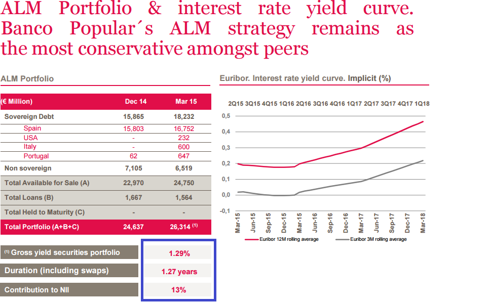 a yield é baixa, o que é normal pois o banco popular tinha muito lixo no balanço e fez muitas mais valias para o limpar tendo inclusivamente descido de 1,53% em media no Q4 para apenas 1,29% no Q1 o que significa que o banco foi vendendo títulos mais antigos com cupões superiores e comprando emissões mais recentes. Curiosa a compra de 232m de divida dos EUA numa altura em que o QE por lá acabou e no curto medio prazo as yields podem subir, mas aqui o truque é a aposta na queda do euro face ao dolar( ainda que seja uma aposta limitada 1% da carteira, fica a curiosidade