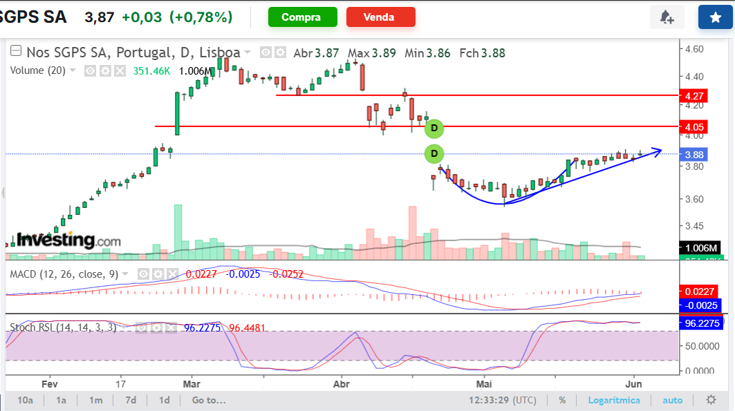 Àlvaro Escreveu:Três dias depois aproximou-se do alvo em 4.03. E aí, havendo, havendo uma ligeira hipótese de recuar em 3.95 vendi para usar a liquidez no que considero melhor investimento, E foi por isso que lá foram elas. Queria que tivesse ido mais depressa a 4.03, não foi e então foram de vela. Mas continua a acreditar que vá a 4.