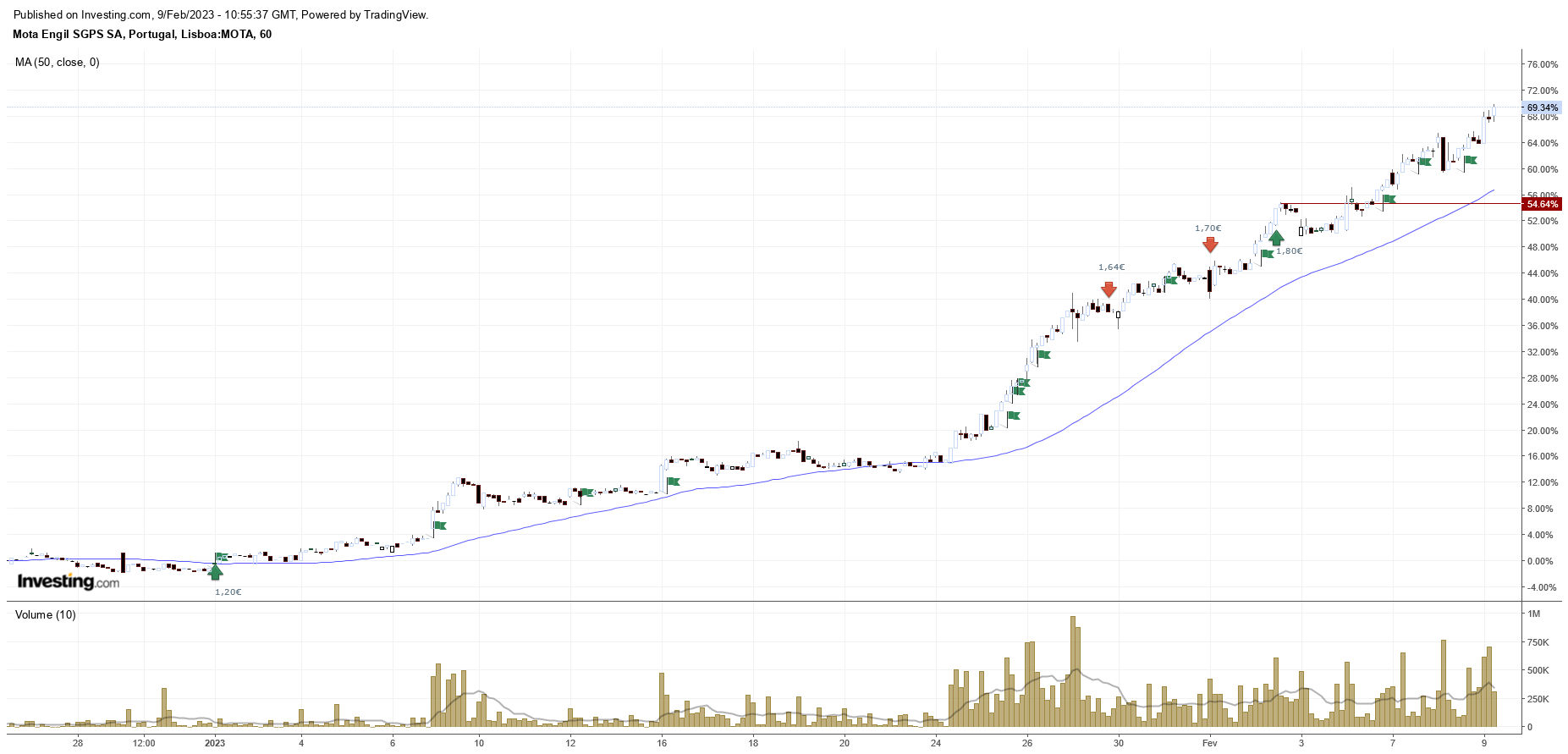 Lá virão dizer que a Mota não vale nem 1 euro face ao negócio, ao Ebitda, à dívida, aos chineses, mas não é essa auditoria que faz subidas destas (nem as descidas, quando os fundamentais ainda estão ótimos e as facas caem porque o gráfico simplesmente já mandou cair).