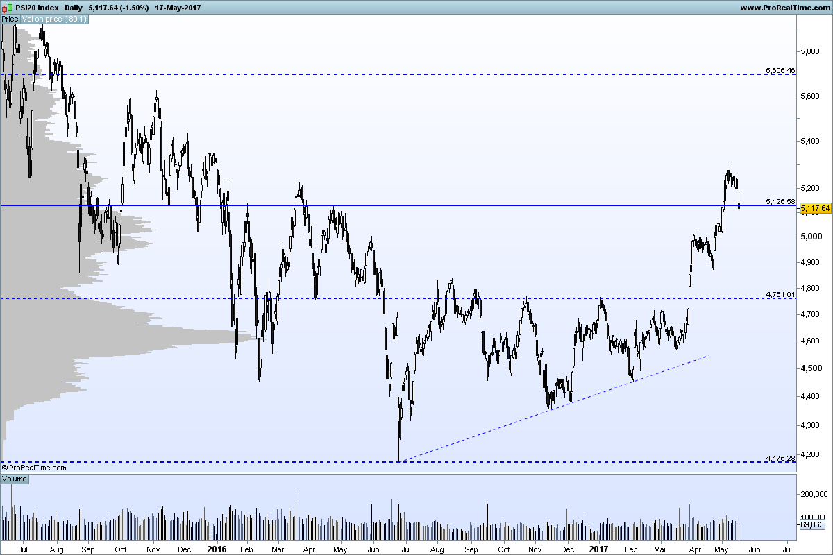 Após mais um "momento Trump", e dada a gravidade potencial para o S&P500 (e por arrasto para todos os mercados), é sempre difícil determinar se estamos perante uma correção do PSI20 (e do seu benchmark Ibex35), ou se se pode tratar do início de um Bear market, com hipotético crash à mistura (quando Nixon se demitiu em 1976, o Dow caiu 42% e o PIB 1,2%). PSI20 encontra-se a corrigir, tendo suportes próximos nos 4990 e na MMS50 (Bull não está em causa).