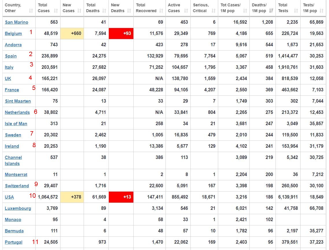 Portugal é o 19º pais em casos em valor absoluto, por habitante é 13º pais (porque tem uma das maiores percentagens da população testada, 11º a nível mundial), a nível de óbitos por habitante é o 12º (a Suécia é o 7º com 2,5x a mais que nós).