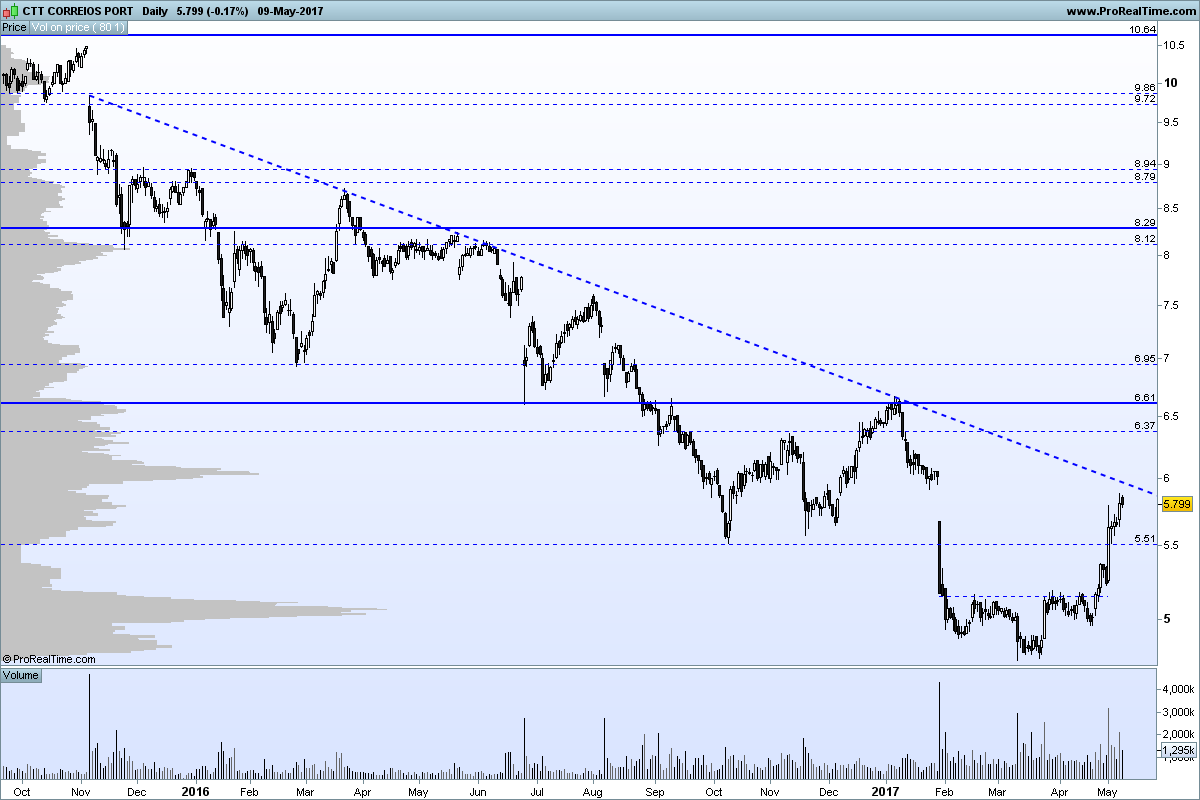 Trendline descendente com 17 meses, nos 5.9€ » resistência móvel que define a rutura com uma antiga linha, como fronteira gráfica Bear/Bull.