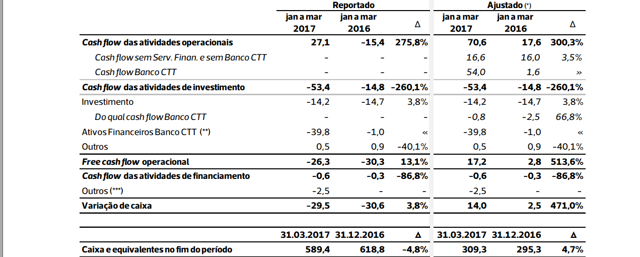1º TRIMESTRE POSITIVO: O indicador cash flow das actividades operacionais (excluindo a variação líquida de credores de serviços financeiros), aumentou de 17,6 M€ no 1º trimestre de 2016 para 70,6 M€ no 1º trimestre de 2017". (free cash flow operacional ajustado de 17,2 M€). Activo aumentou 2,7%, capital próprio aumentou 4,7%, passivo só aumentou 2,3% (sobretudo devido ao aumento de depósitos de clientes). DY9,2%/dividend 48 cents, é passível de manter-se em 2018 (ver importante ponto 6).