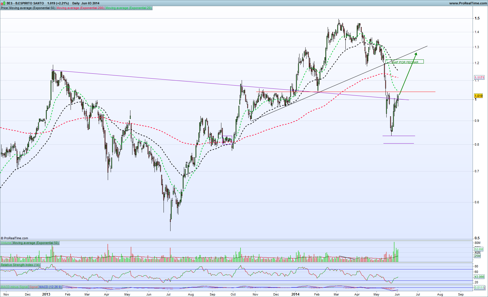 O meu target para os próximos dias é por volta dos 1,06~1,07. Apesar de no diário haver uma resistência nos 1,04... com estes volumes não vejo outra maneira que não seja um derreter de resistências antigas.