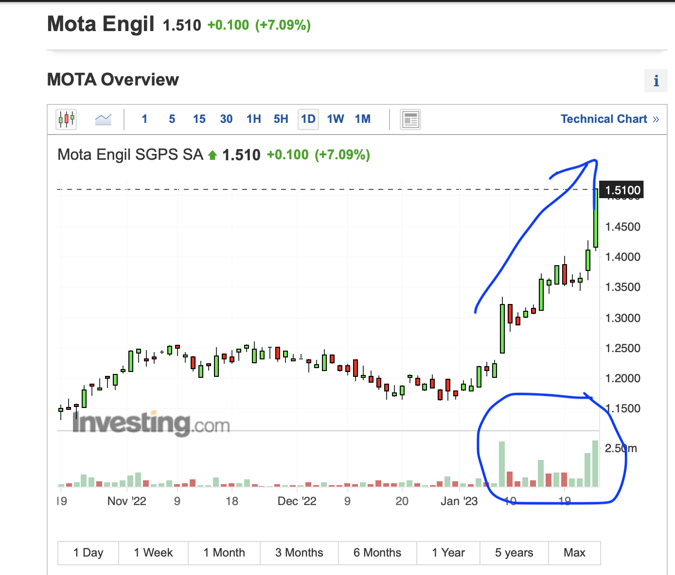 Tinha definido vender metade da posição nos 1,50€, mas fora de questão largar alguma coisa enquanto ela for mostrando esta força e volume. Até lá, é deixar ir a favor do vento, e depois equilibrar a carteira.