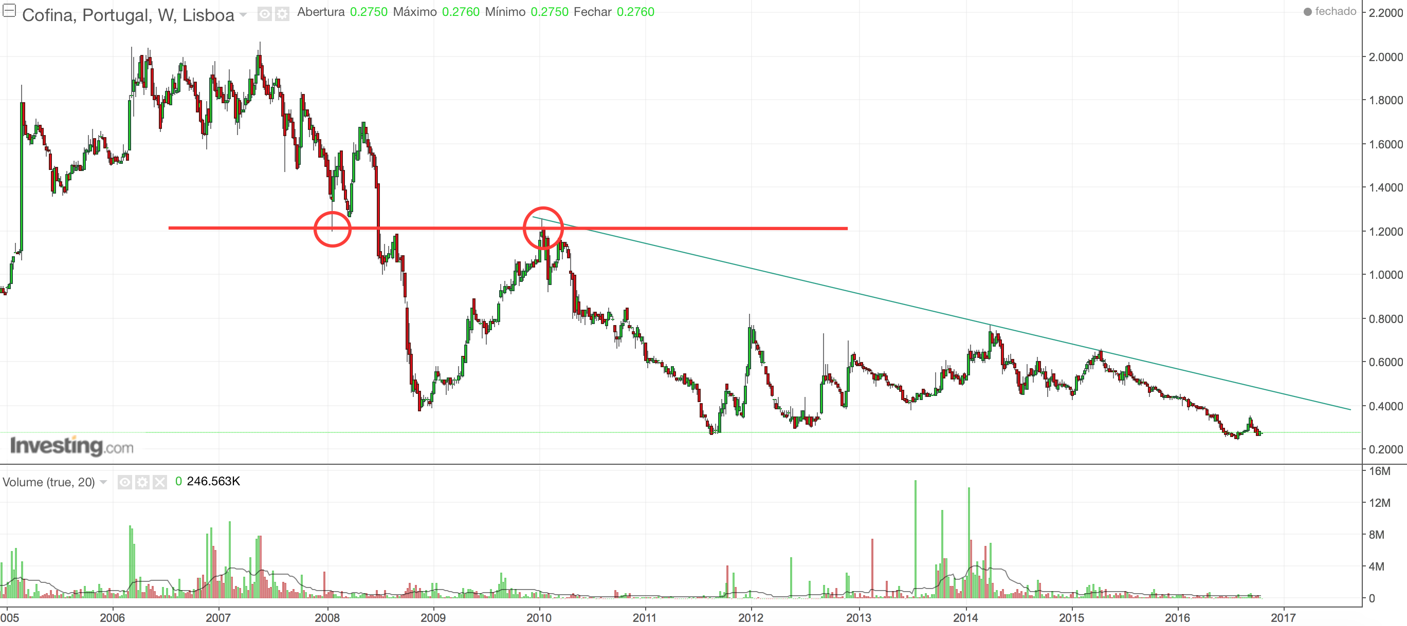 No gráfico está mais uma vez evidente o valor dos suportes e resistências. No caso que se encontra identificado com os círculos vermelhos, os 1,2€ foram suporte no início de 2008, e quando a Cofina atingiu os mínimos no final desse ano iniciou uma recuperação que terminou precisamente nos…1,2€. Mais um caso em que um suporte se torna resistência. Assim até parece fácil negociar…