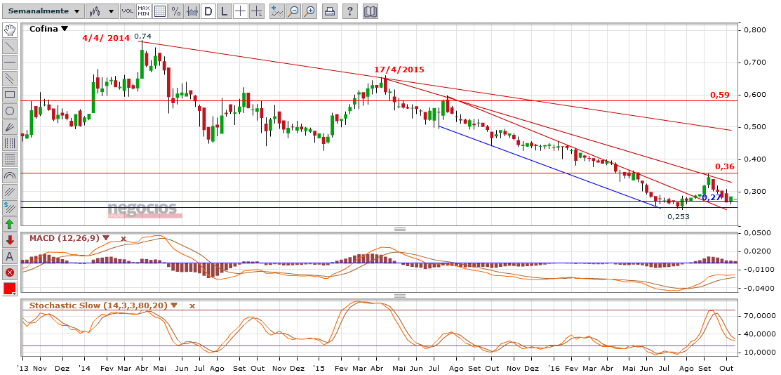 A Cofina foi uma empresa que, como quase todas, sofreu com a crise de finais de 2007, desvalorizando de cerca de 2€ para aproximadamente 0,4€ no final da turbulência. Desde então a Cofina está em Bear Market, tendo apesar de tudo um longo período de lateralização entre os 0,25 e os 0,77€, aproximadamente. No entanto, como não consegue estabelecer novos máximos relativos, não podemos dar por interrompido o Bear Market, até porque se identifica claramente um linha de tendência descendente já com 3 toques (ver gráfico abaixo).