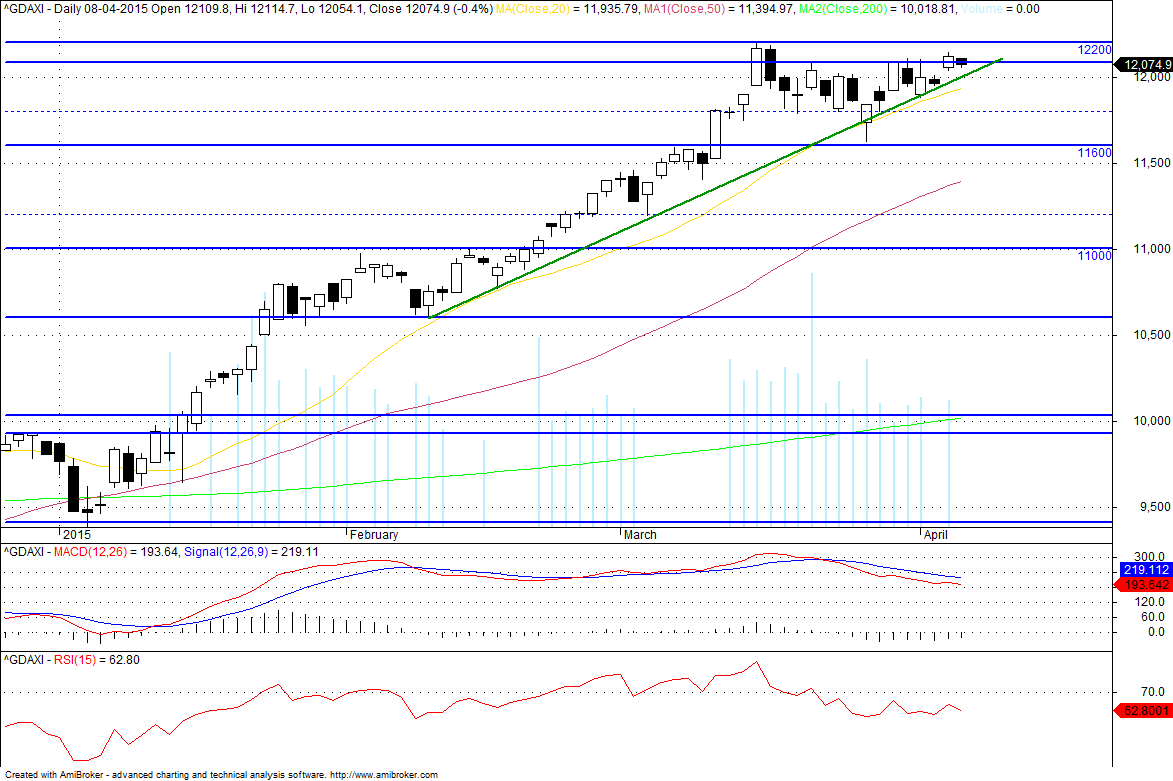 Para mim o DAX nao está a fazer nada há semanas! Apenas lateraliza num rectangulo agora cmprido e estreito. Se isto é uma forma de aliviar indicadores antes de subir ou de prenuncio de queda, não faço a minima ideia!