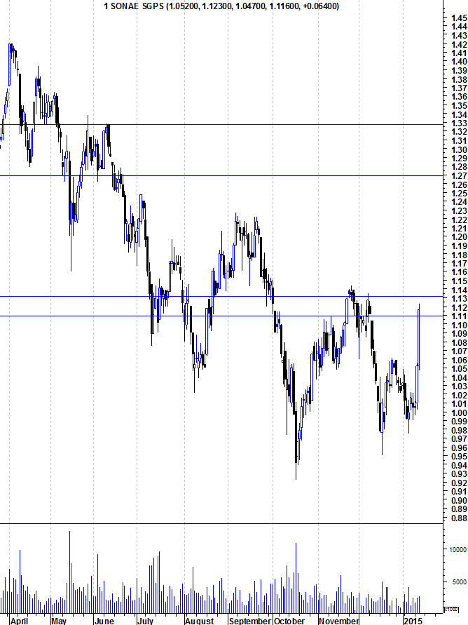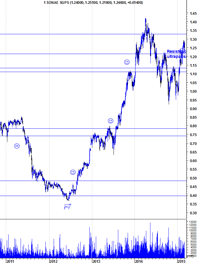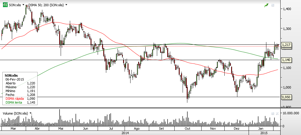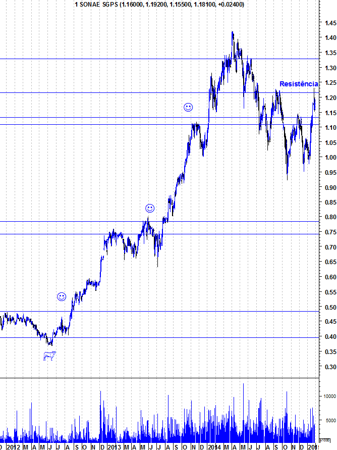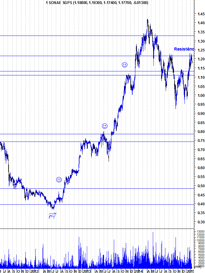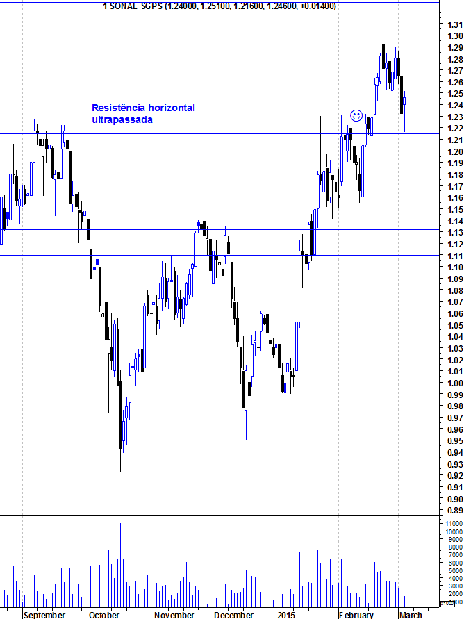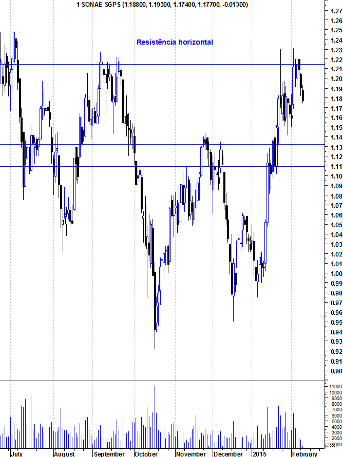 Aqui ficam os gráficos actualizados da Sonae, depois da sua natural reacção em baixa à importante resistência horizontal entre os 1,21 e os 1,22 euros.