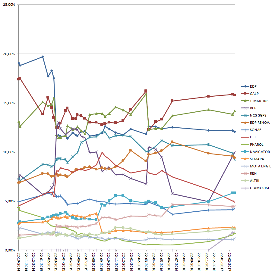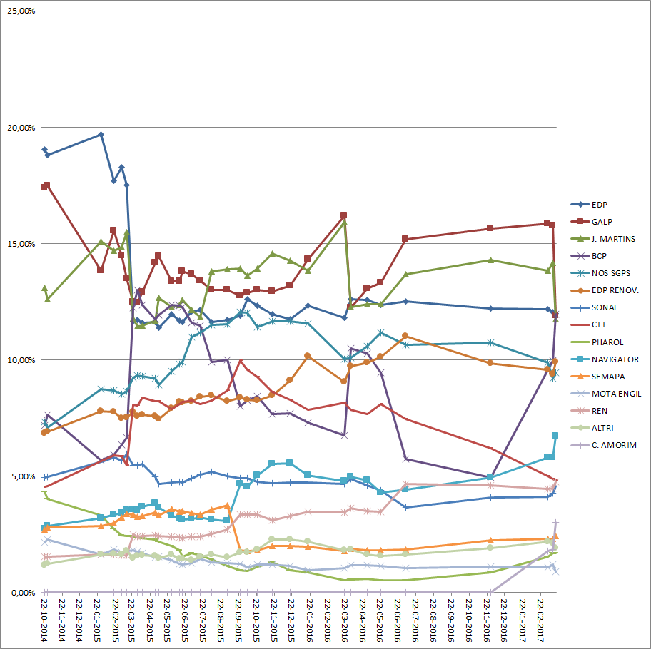Estou a começar a acompanhar mais o PSI ultimamente, apesar de não haver nada relevante que me faça estar perto de investir nas cotadas que o compõem, apesar disso acho que começa a dar alguns sinais interessantes.
