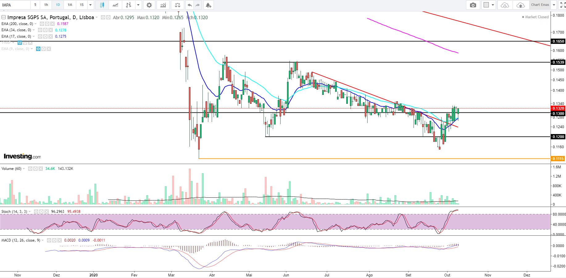 A Impresa a fazer um esforço para conquistar o máximo do mês de setembro nos 0.1320€ , surgiu um pouco mais de volume e nada mais de especial para já.