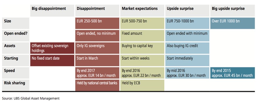Esta noticia não é coerente com o insight da UBS a seguir indicado, uma vez que o valor previsto do QE de 50 mil milhões €/mês até ao final de 2016, citado no referido relatório do BCE, corresponderia a um valor superior às expetativas do mercado segundo os técnicos da UBS, pelo que não se compreende o reflexo na queda das ações europeias durante o período da manhã, as quais só ficaram positivas após a abertura da bolsa dos EUA em que subiram a pique imediatamente a seguir às 14:30 H. O que vale é que o mercado tem as costas largas, nunca se engana e tem sempre razão, ..., mesmo que a sua matemática de curto prazo esteja incorreta ... como eu gostava de ter o estatuto do mercado, porque aí em vez de o tentar seguir, punha-o a seguir os meus insights, e nesse caso a Dilma teria perdido as últimas eleições.