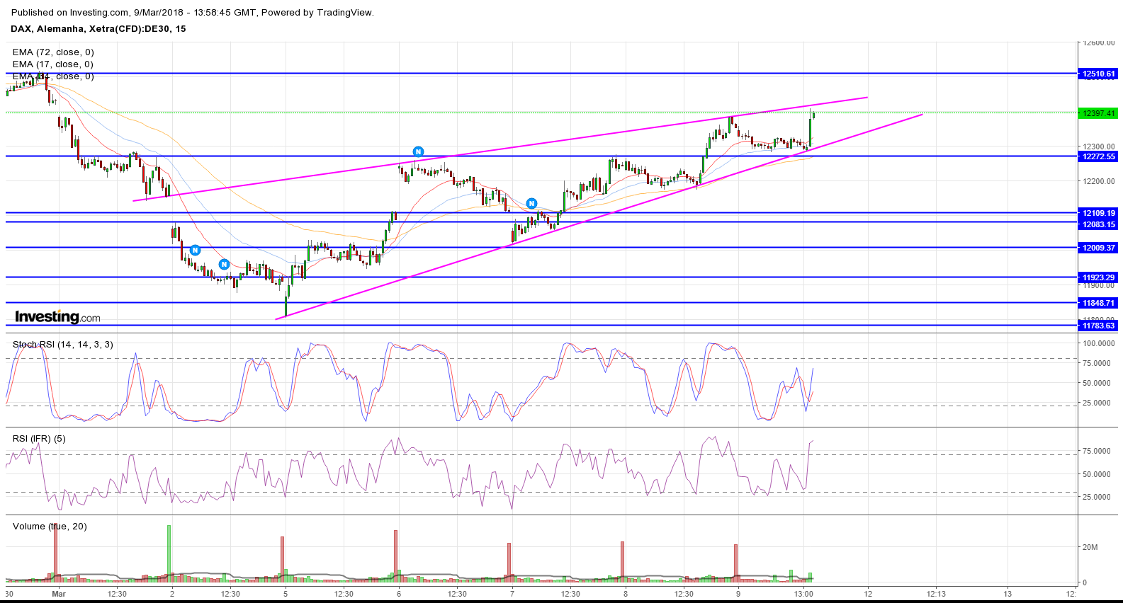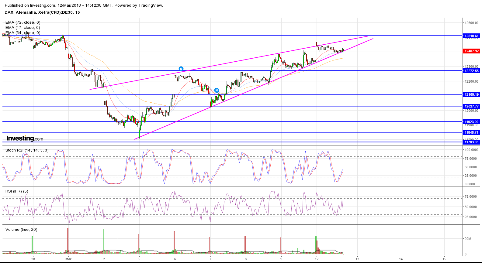 O DAX aparenta estar a evoluir em um canal descendente de curto prazo , sendo que a probabilidade maior neste momento parece ser visitar a base inferior do canal e suporte nos 11900, sendo o sentimento neste momento negativo.