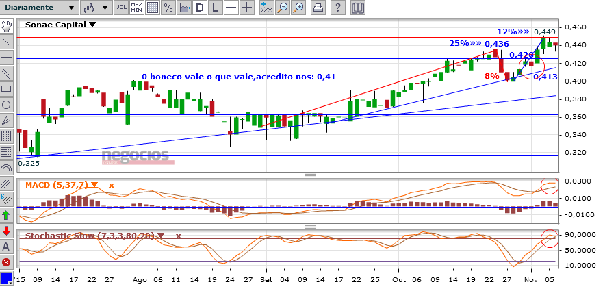 No entanto, socorrendo-me do que tenho disponível, arrisco-me a dizer que depois de consolidar acima dos: 0,52 €, ( 30% ) terá como objectivo os: 0,80 €, ( claro que terá que descansar pelo caminho ) uma valorização de 100%, considerando o arranque dos: 0,40 €.