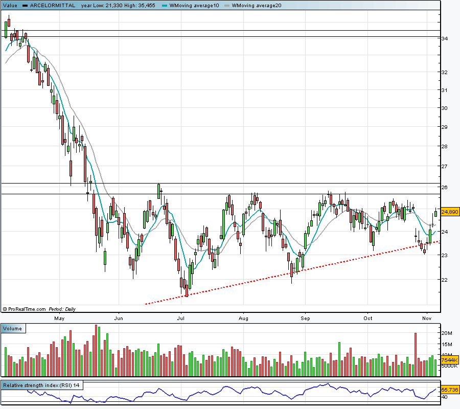 No passado dia 6 de Julho a Arcelormittal iniciou um rebound que, naquela altura, pareceu-me bastante promissor. A cotação aproximou-se rapidamente dos € 26,15 (patamar máximo do último rebound) e os seus indicadores técnicos apontavam para uma continuidade das subidas.