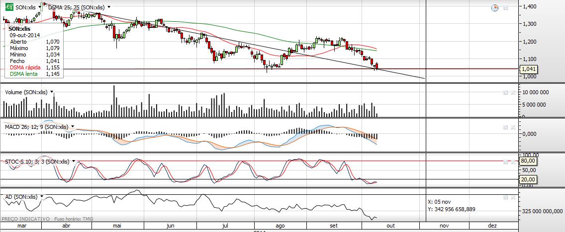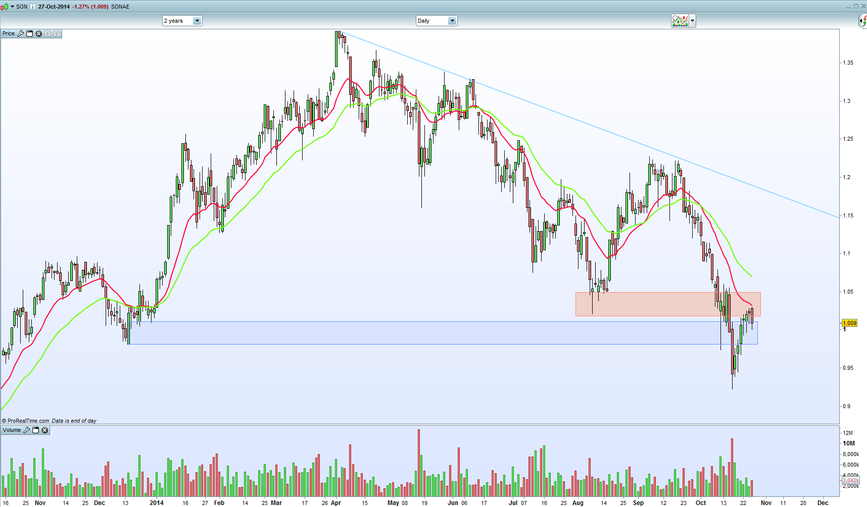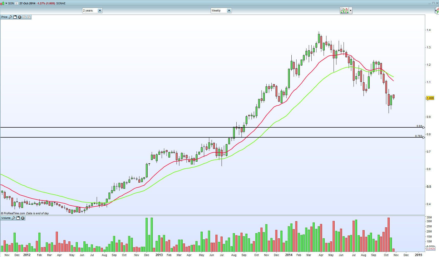 Eu não sou muito estendido em padrões desse género, mas se a sua formação fizer sentido, então esse H&S aponta à zona dos 70 e poucos cêntimos, zona de suporte significativa na SONI.