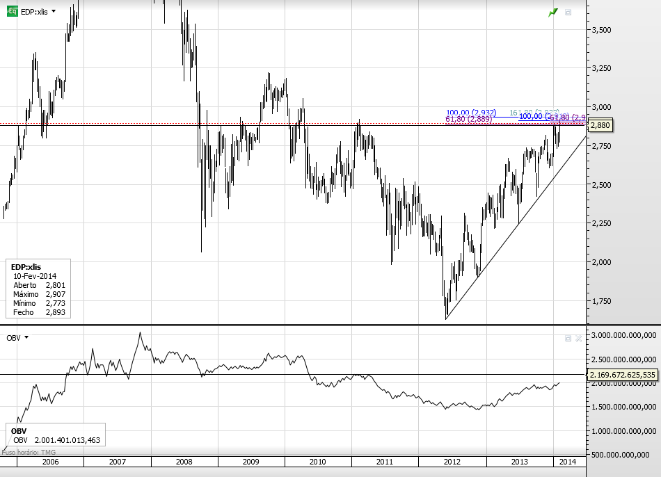 A julgar pelos anteriores movimentos da EDP parece-me que deve estar para breve uma "correcçãozita" a qual coincide com uma resistência de 2010 ... os 3€. Não é que seja mau uma correcção, visto que pode permitir reforços de posição.