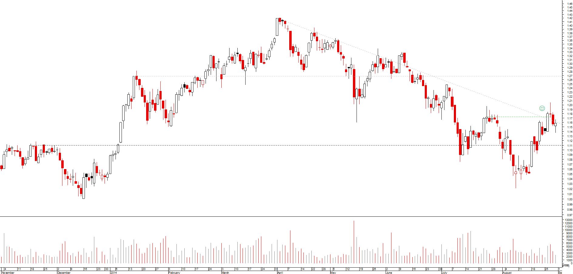 Exatamente o mesmo, semanal e diário dão-nos imagens diferentes mas muitas vezes ideias parecidas, enquanto a cotação andar acima da tua linha verde , (1,16), a tendencia de curto prazo é positiva...