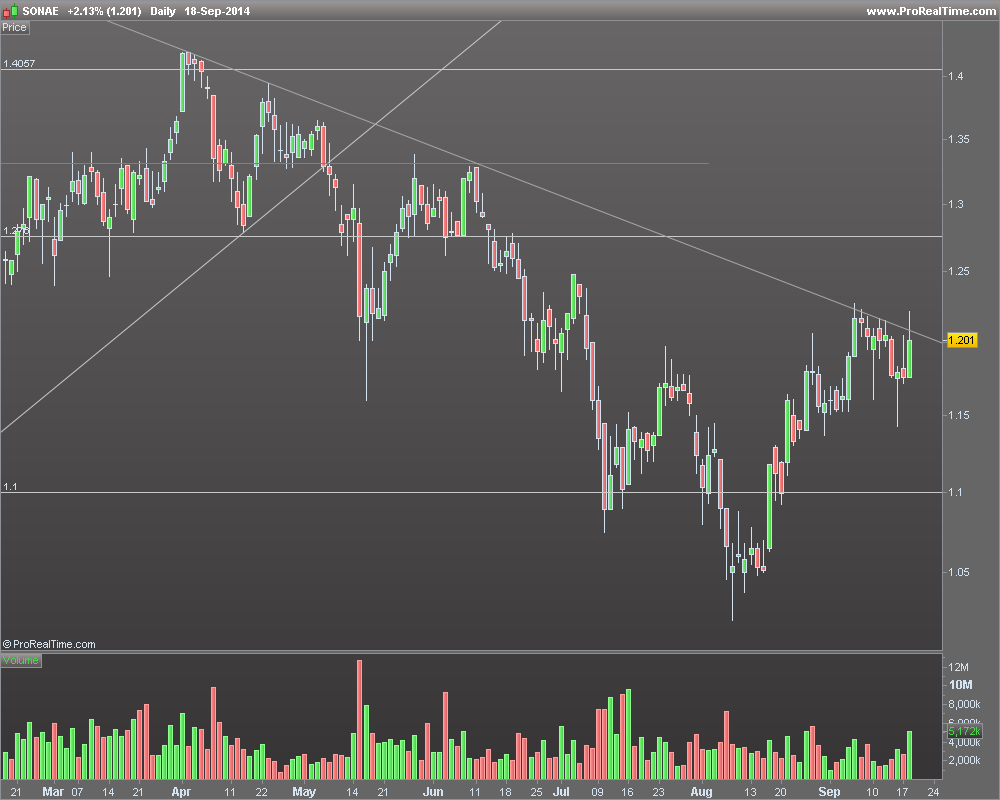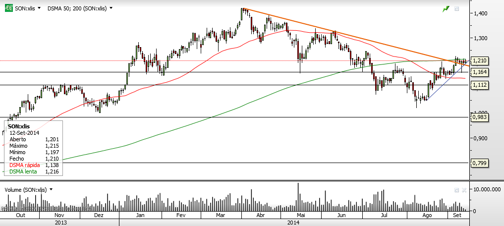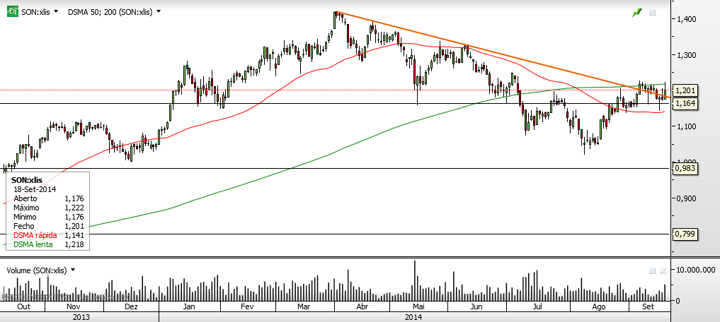 já agora, acrescento que apesar da sonae estar sob uma LTd, já a penetrou por duas vezes (o que realmente por si nada quer dizer), mas fez entretanto um higher high, o que é um primeiro sinal de força; a continuação para a inversão da tendência seria fazer um higher low e rematar com um novo higher high