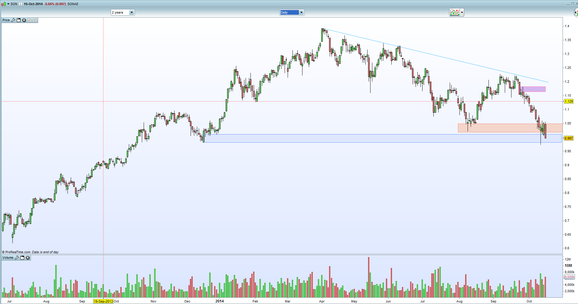 Digo de forma consistente porque esta linha de tendência está traçada em zonas de acumulação. Teria de haver uma fuga clara á linha para Sul para considerar que foi rompida.