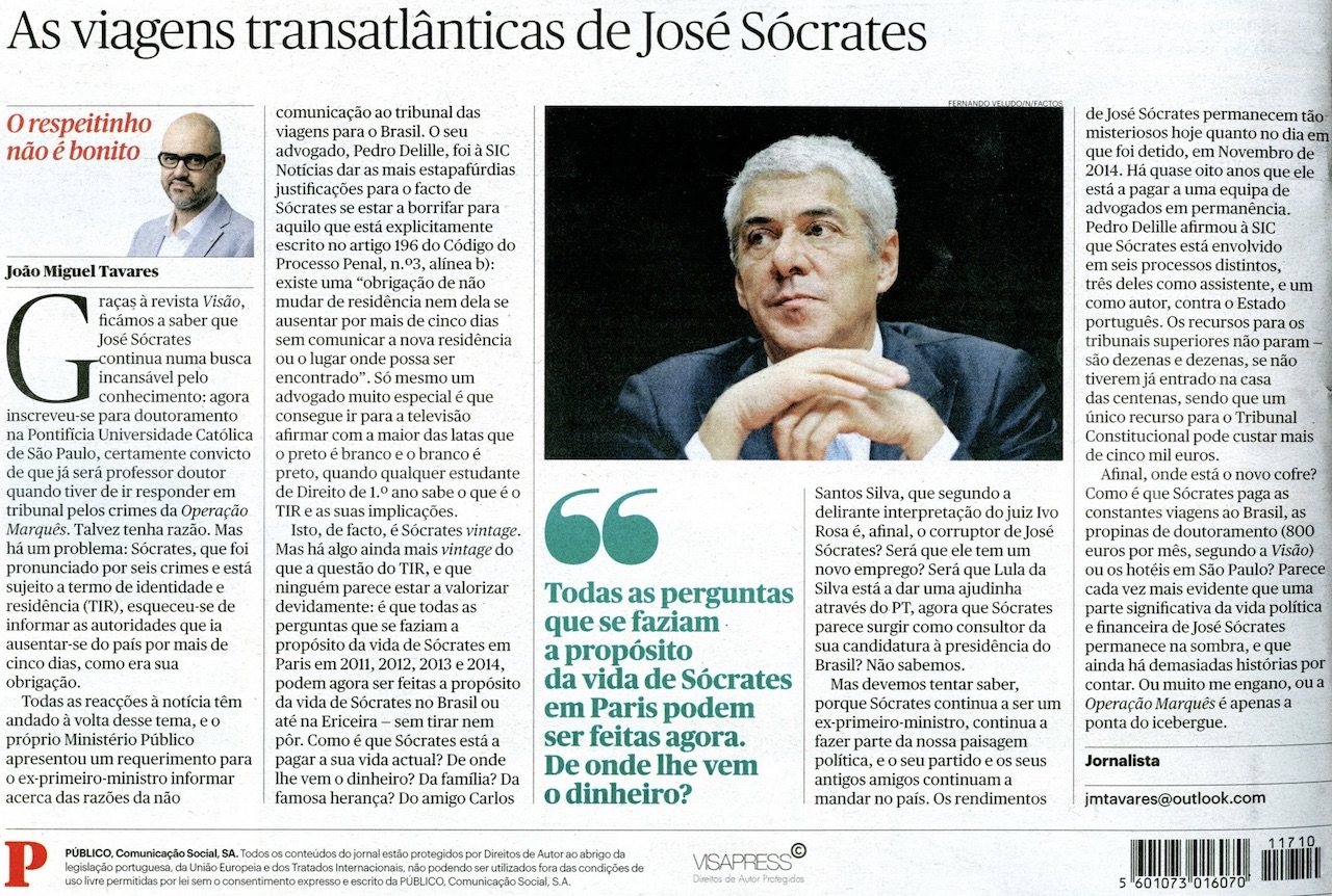 Todas as perguntas que se faziam a propósito da vida de Sócrates em Paris em 2011, 2012, 2013 e 2014, podem agora ser feitas a propósito da sua vida no Brasil ou até na Ericeira. Como é que está a pagar a sua vida actual? De onde lhe vem o dinheiro?
