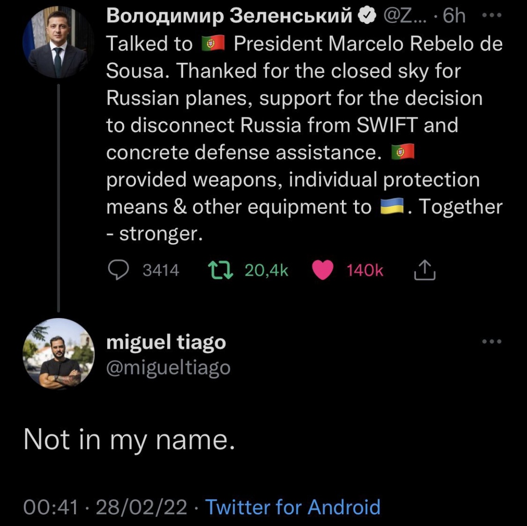 Esta segunda-feira, o antigo deputado do PCP Miguel Tiago fez questão de dar mais um passo no seu posicionamento em relação à Ucrânia e comentou uma publicação do presidente Volodymyr Zelensky, em que este agradecia o telefonema de apoio do Presidente da República português e os contributos de Portugal (que enviou armas e equipamento de proteção individual para a Ucrânia). “Não em meu nome”, quis esclarecer Miguel Tiago.