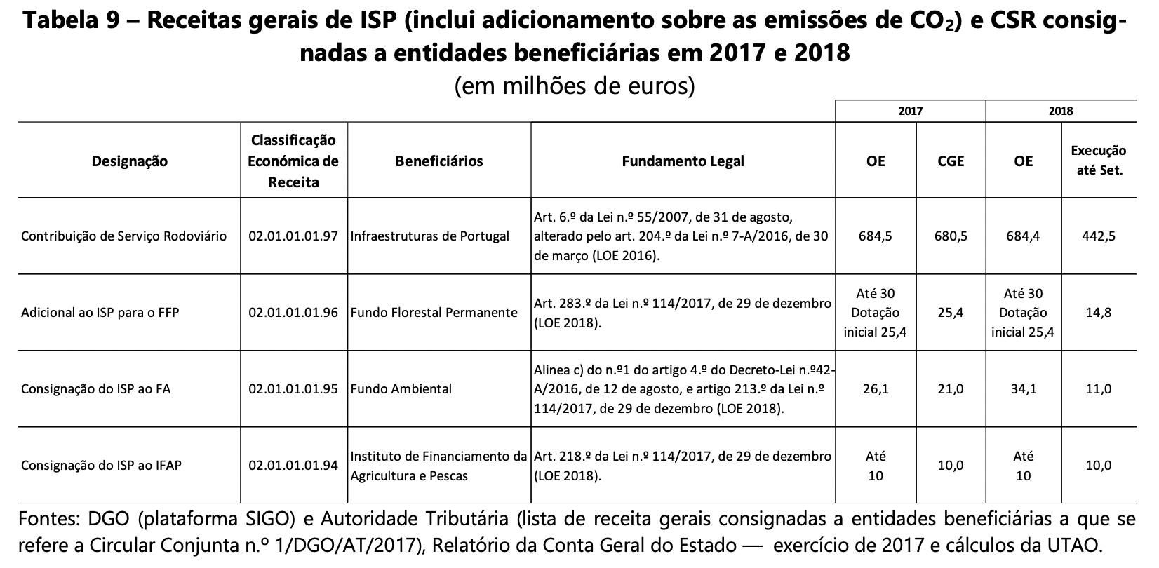 A receita fiscal proveniente dos impostos CSR e ISP é parcialmente consignada a entidades como contrapartida do financiamento de programas e estratégias nacionais. De acordo com indicação da DGO, as entidades que beneficiam de receitas gerais consignada dos impostos CSR e ISP são a empresa pública Infraestruturas de Portugal, S.A., o Fundo Florestal Permanente, o Fundo Ambiental e o Instituto de Financiamento da Agricultura e Pescas (I.P.) - IFAP.