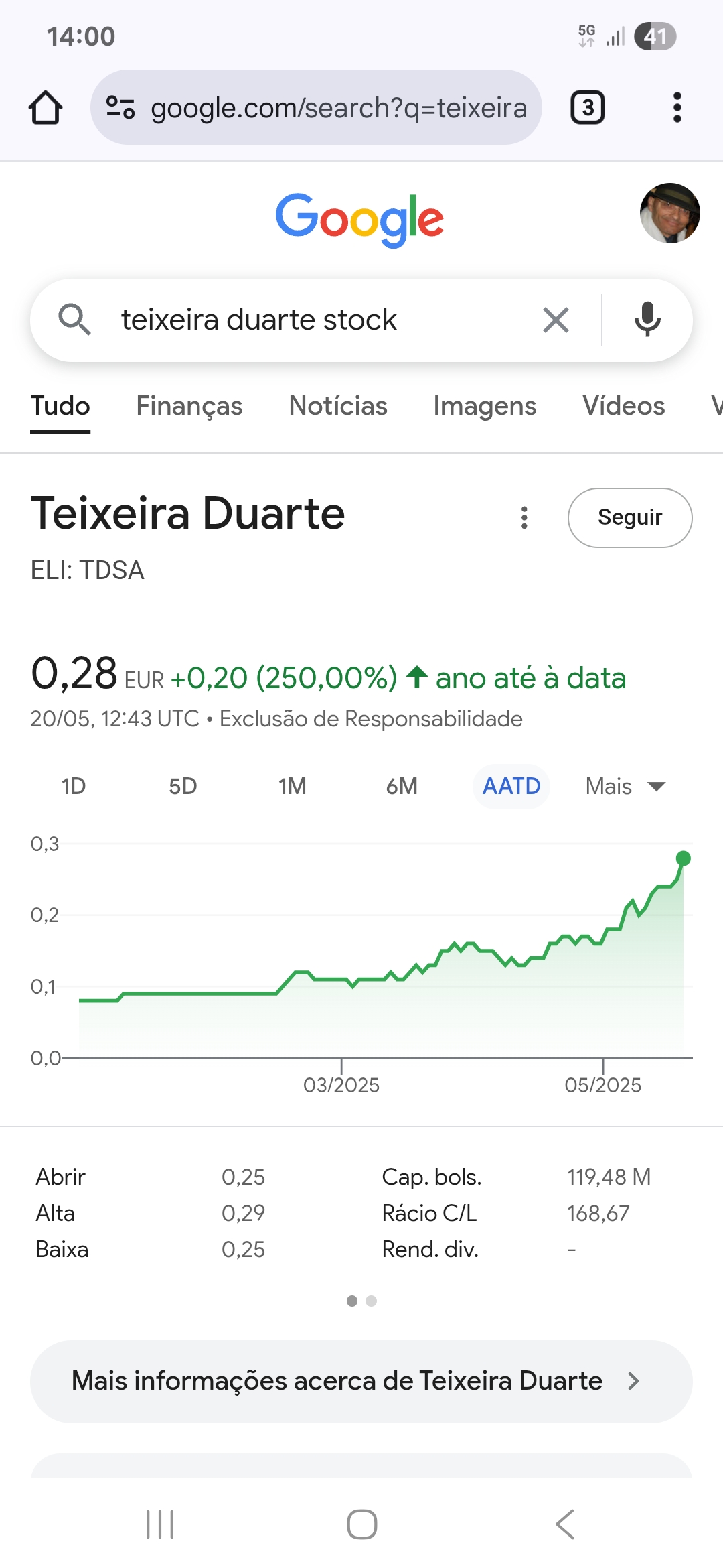 A margem para valorização da Teixeira Duarte é grande , neste momento é possivel atingir um market cap de 150m€ a médio prazo . Para comparar no mercado nacional a Teixeira Duarte tem 1/10 sim 10% do valor de mercado da Mota Engil, só o dia de ontem de valorização da ME foi todo o market cap da TD