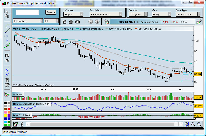 A minha visão para a renault é que neste momento e ainda para mais com a saída dos resultados um pouco abaixo do esperado (ainda que com crescimento nas vendas) ela não irá fazer a tal visita aos 90 quanto muito poderá ir aos 74,50/75 mais coisa, menos coisa, isto também porque acho que de momento com o petróleo com o preço a que está o sector automóvel possa não ser dos melhores sectores para apostar em grandes subidas.