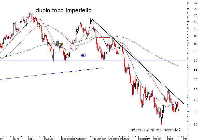 O duplo topo (imperfeito) nos 120, com linha de procura nos 90, permitia antecipar uma projecção para os 60 euros, que foram atingidos em Março.