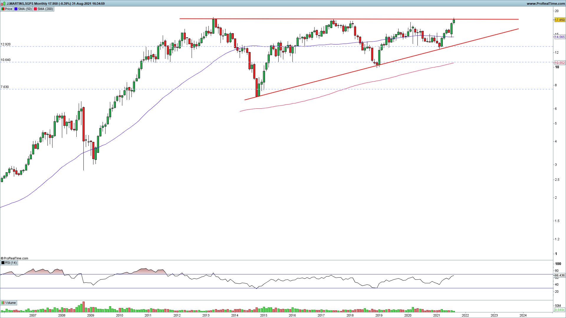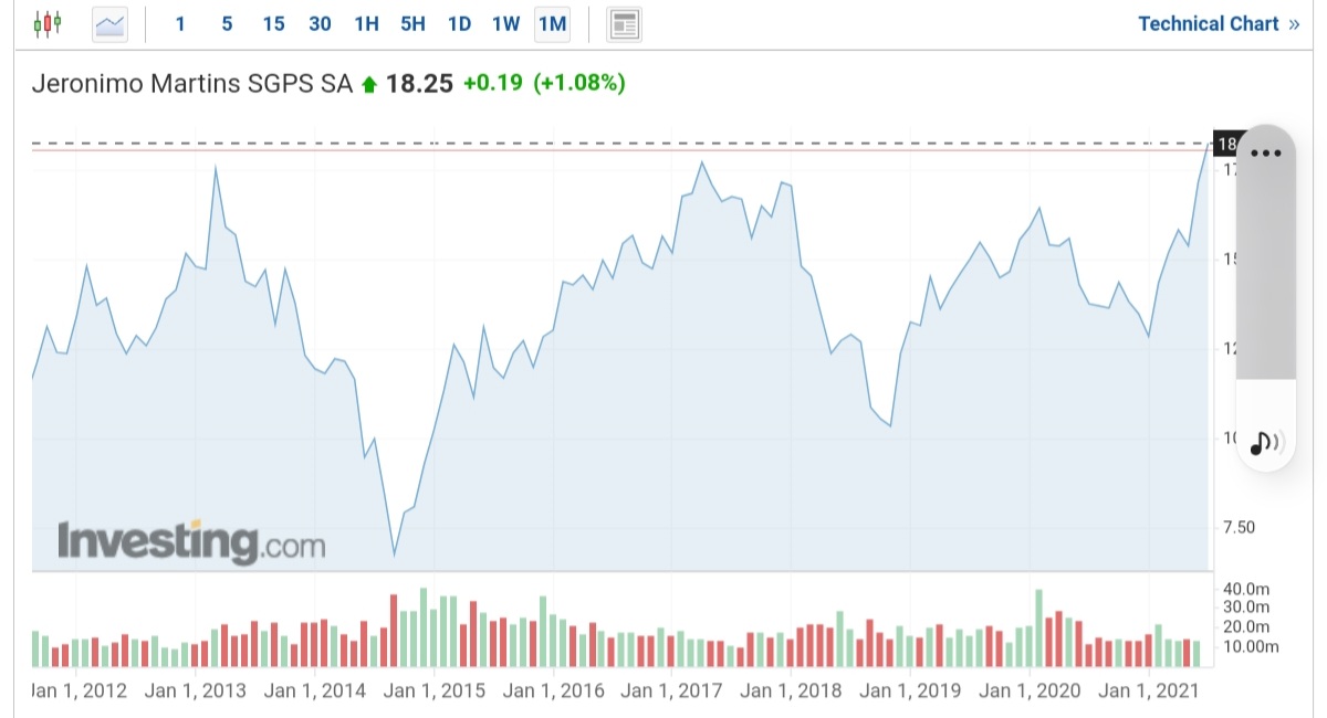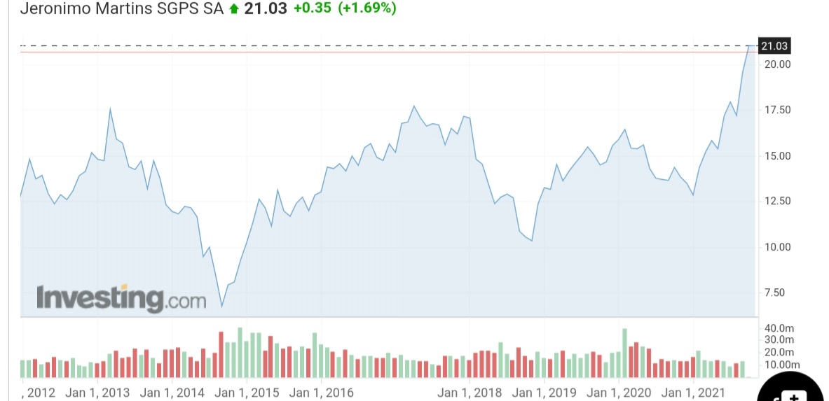 JMT passou hoje os 21€. Atingiu os máximos de sempre há algumas semanas e continua a subir - subiu 20% desde os últimos máximos ali por volta dos 17.5€.