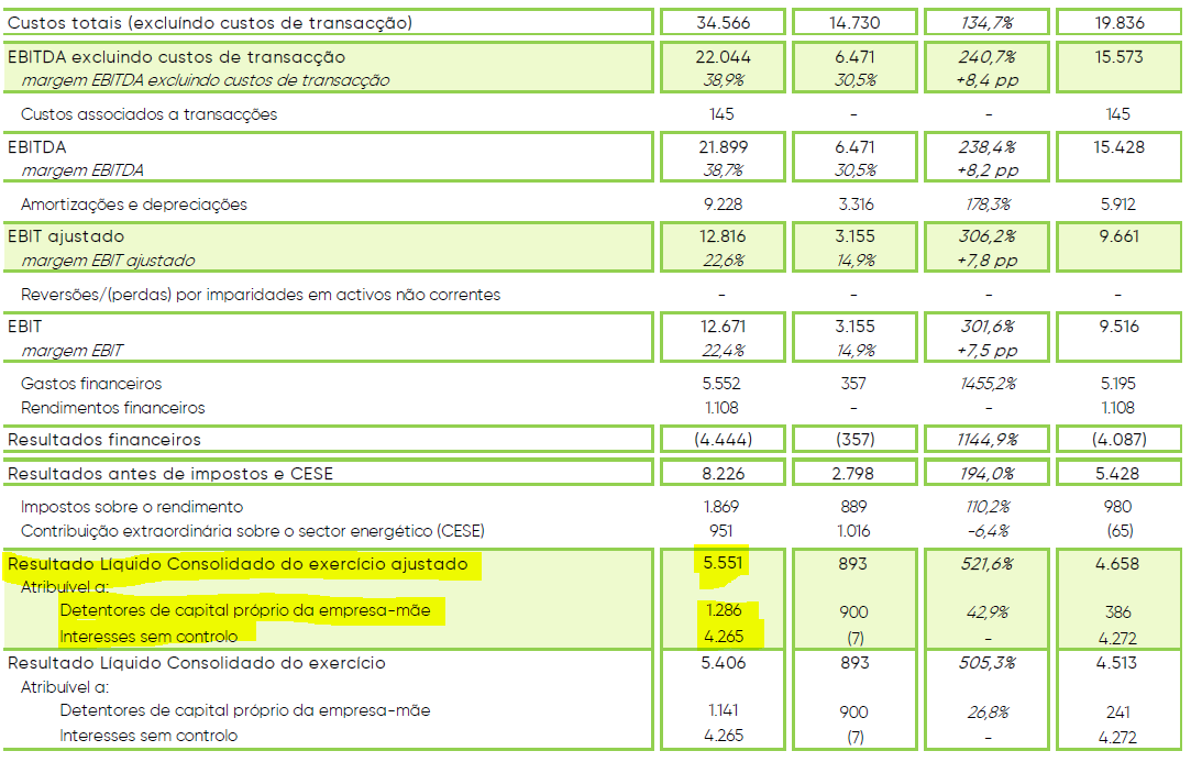 Ora, fazendo a separação desse perímetro consolidado de empresas e respetivos Resultados Líquidos, o Resultado Líquido (consolidado) Atribuível aos Acionistas da Greenvolt até março é de €1.286.000,00.