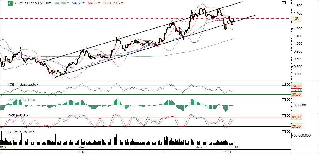 Negociarembolsa Escreveu:Voltando ao gráfico do BES, por exemplo. Um dos motivos que nos levou a declarar um sinal de compra foi a quebra em alta das médias móveis dos últimos 20 e 50 dias (EMA20 e EMA50). Logo, será lógico que uma quebra em baixa dessas médias móveis, que estão na zona dos 1,31€, desde que feita consistentemente e com forte volume, constitua um primeiro sinal de invalidação do sinal de compra. A total inversão do sinal de comprar dar-se-ia com um fecho abaixo do fecho de quinta-feira, por volta dos 1,27, e um claro sinal de venda ocorreria, na nossa opinião, com uma quebra em baixa e volume elevado da EMA150, que se encontra nos 1,24€ (embora os 1,20€ tenham constituído suporte anterior e ainda possam segurar a cotação).