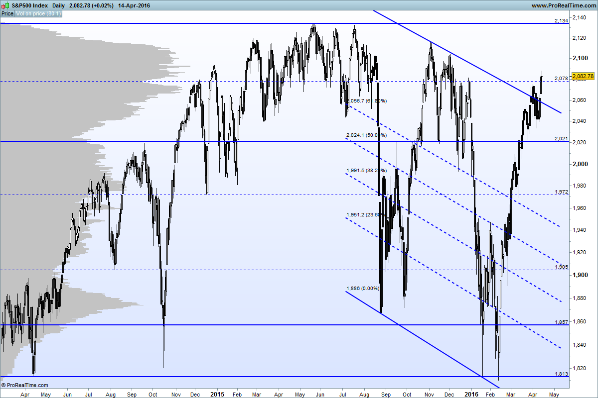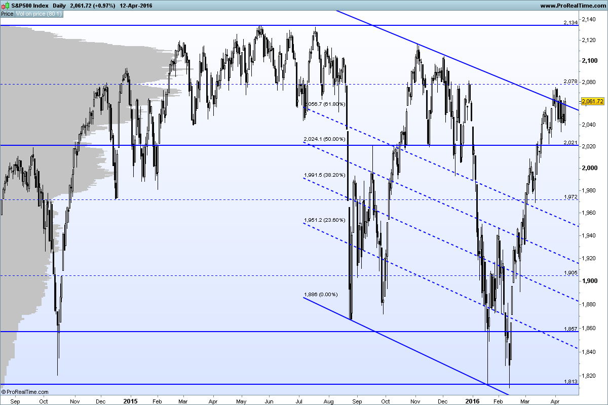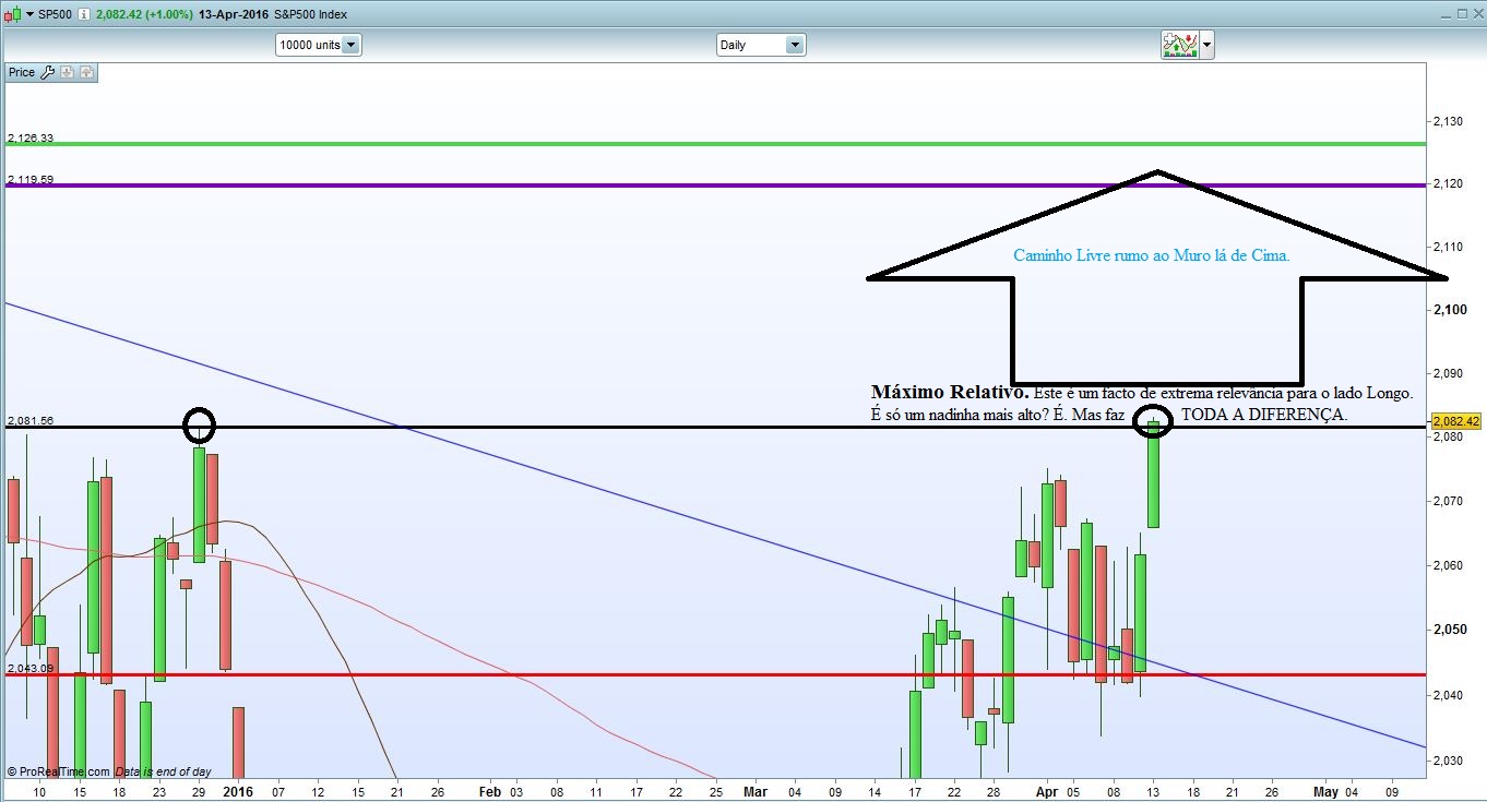 Apenas porque estou do lado curto da barricada, apresento mais 3 factos técnicos e macro que suportam o curto: petroleo em zona de resistência, EURUSD em zona de resistência e reparei que o volume do S&P hoje não foi nada de especial (bateu na MM50 de volume). No entanto, do lado longo destaco novo maximo relativo e vela bastante longa e verdinha. O mercado dirá quem está do lado certo