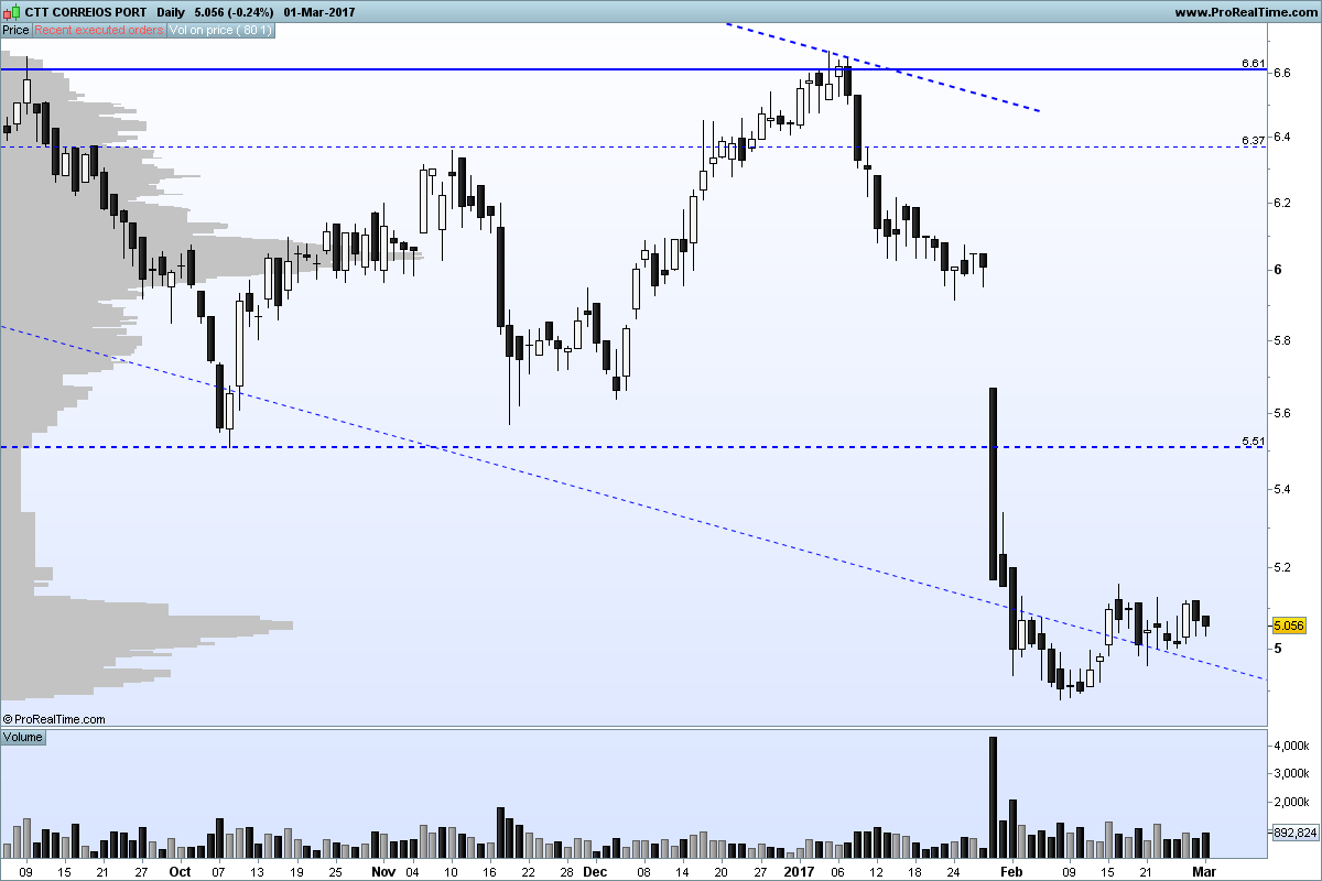 A pesar de tudo o referido temos uma formação de inversão (02 a 14/02) quebrada em alta. De seguida faz um higer low (4,987) que ainda não foi quebrado.