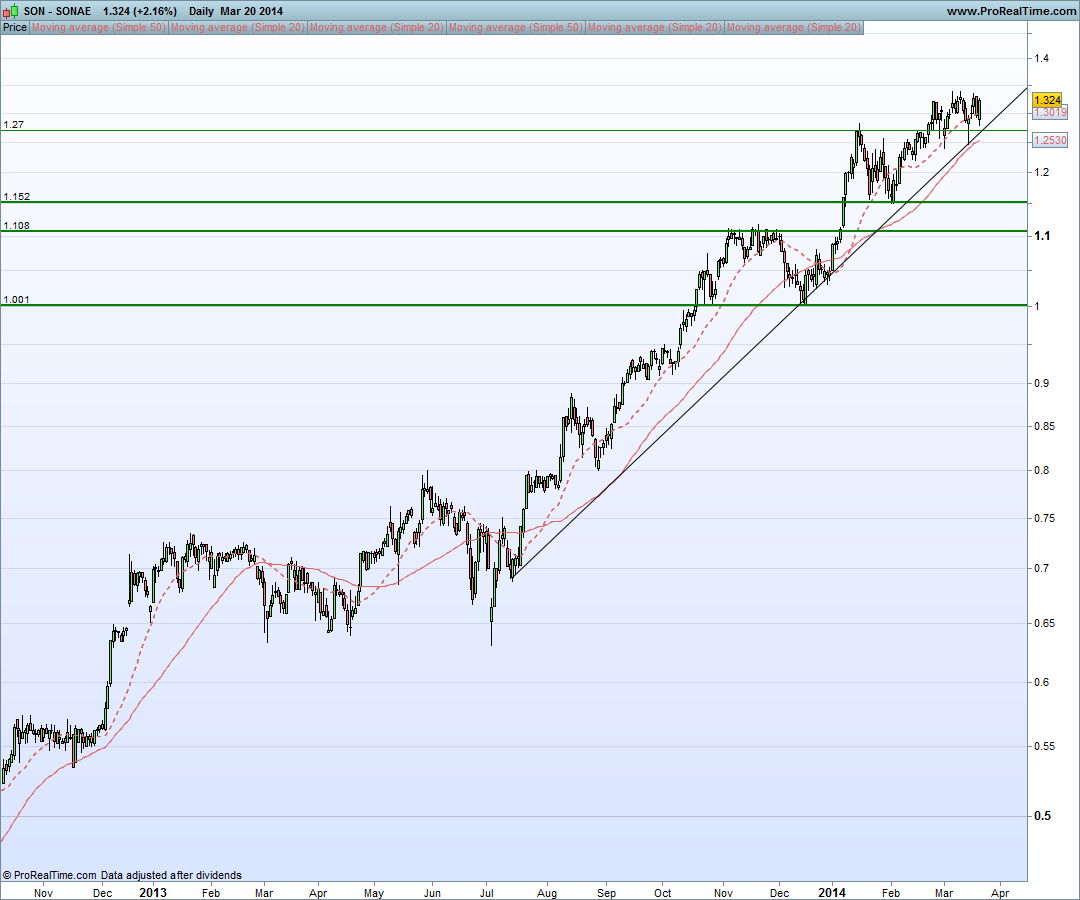 Pequeno suporte na casa dos 1.26 aproximadamente com LT ascendente válida! Enquando LT não for "violada" e suporte também não temos muito com que nos preocupar!! Próxima resistência considerável do meu ponto de vista 1.70 aproximadamente! O suporte que me refiro não é muito forte, caso haja correcções fortes no PSI 20...1,12, aproximadamente é o suporte mais forte que temos nesta acção!! Fica aqui o gráfico, abraço e boas apostas!!