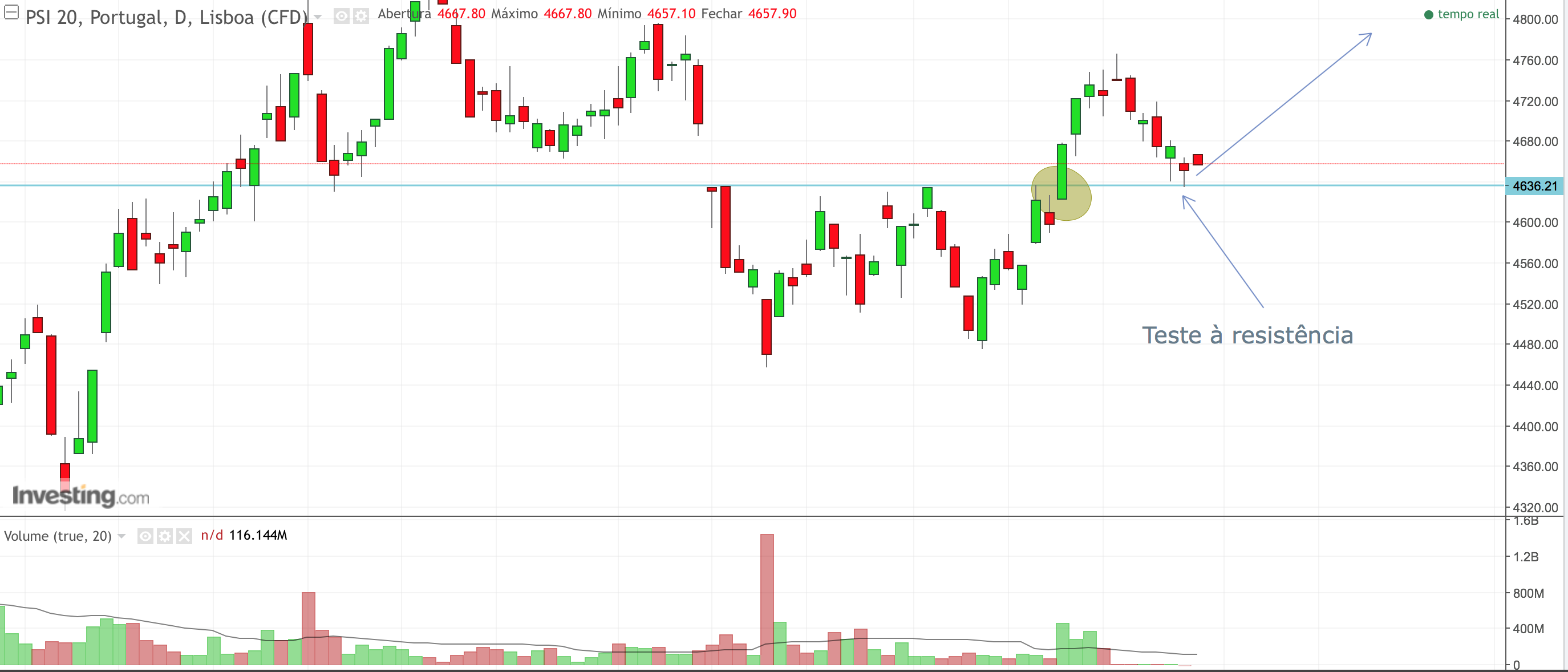 Aqui ficam os gráficos actualizados do PSI. Para os touros seria muito importante produzirem um sinal de força, quebrando a resistência entre os 4800 e os 4850 pontos mas, até ver, o poder dessa resistência continua a fazer mossa.