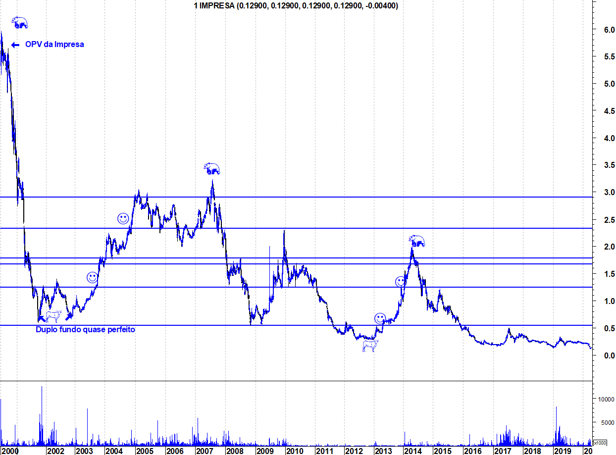 Deixo o gráfico da Impresa desde que entrou em Bolsa. Desde que existe o Caldeirão, há mais de 17 anos, muitos foram os que vieram ao Caldeirão dizer que não deixavam a acção subir, que são os manipuladores que a atiram para baixo. A resposta do mercado foi a que está no gráfico.