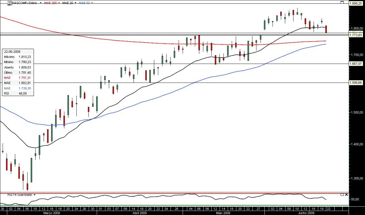 O nasdaq comp. tem andado na frente do pelotao dos indices quer nas correcçoes quer nas subidas. Nos ultimos quebrou os maximos do mes de junho. Quanto a mim está num ponto muito interessante: junto dos 1900. Existe um enorme gap deixado a pressa no inicio do mes de outubro de 2008. Sera que rapidamente vai fechar ou vamos ter correcçoes nesta zona? Acredito mais num misto, isto é, fechar o gap e vir para esta resistencia\suporte para descansar