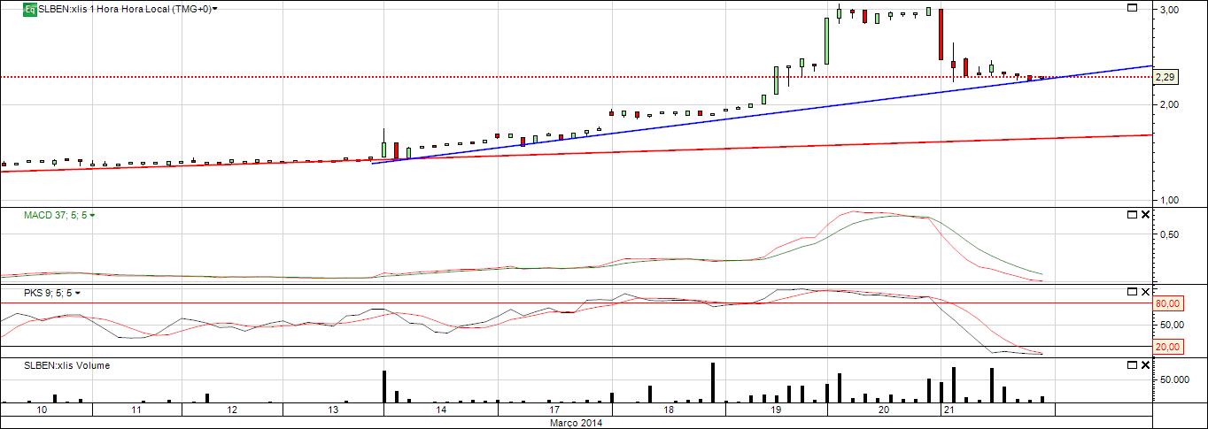 Não sei se poderemos fazer uma análise técnica "fiável" a esta cotada, sendo eu um leigo e estando a dar os primeiros passos em análise, junto anexo duas linhas de tendência traçadas por mim tanto no diário como horário, no entanto não tenho certezas da sua validade.
