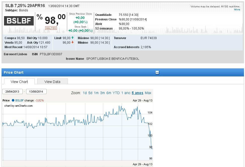 http://economico.sapo.pt/noticias/megafundo-do-bes-investiu-67-milhoes-em-obrigacoes-do-benfica_198118.htmlSLB Escreveu:O saldo dos empréstimos obtidos correntes está influenciado por dois empréstimos obrigacionistas, que totalizam 85 milhões de euros, cujo vencimento é inferior a um ano e pelo programa de papel comercial de 24,6 milhões de euros, que terminava em Janeiro de 2014 e cujas subscrições são efectuadas por períodos máximos de seis meses. De referir que à data do presente relatório, a Benfica SAD já prorrogou o programa de papel comercial por mais cinco anos e, à semelhança dos períodos anteriores, é expectável que possam ser emitidos novos empréstimos obrigacionistas na data de vencimento dos que se encontram em vigor.