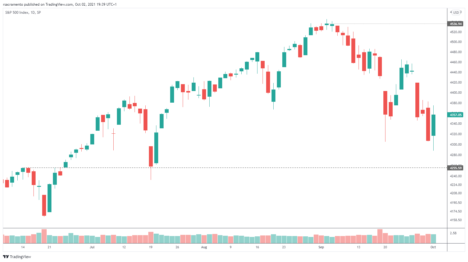 depois de ter ganhado suporte na zona dos 4370-4380 pts, após o pullback da semana passada e das duas sessões desta semana e, a vela de sexta feira ter fechado acima da sua MA(50), o spx enfrenta dois cenários: ou continua a construir mais uma up leg levando-o a realizar novo higher high ou então o índice realizará uma nova leg down após este bounce das últimas 3 sessões.