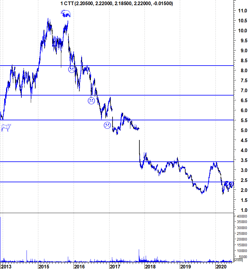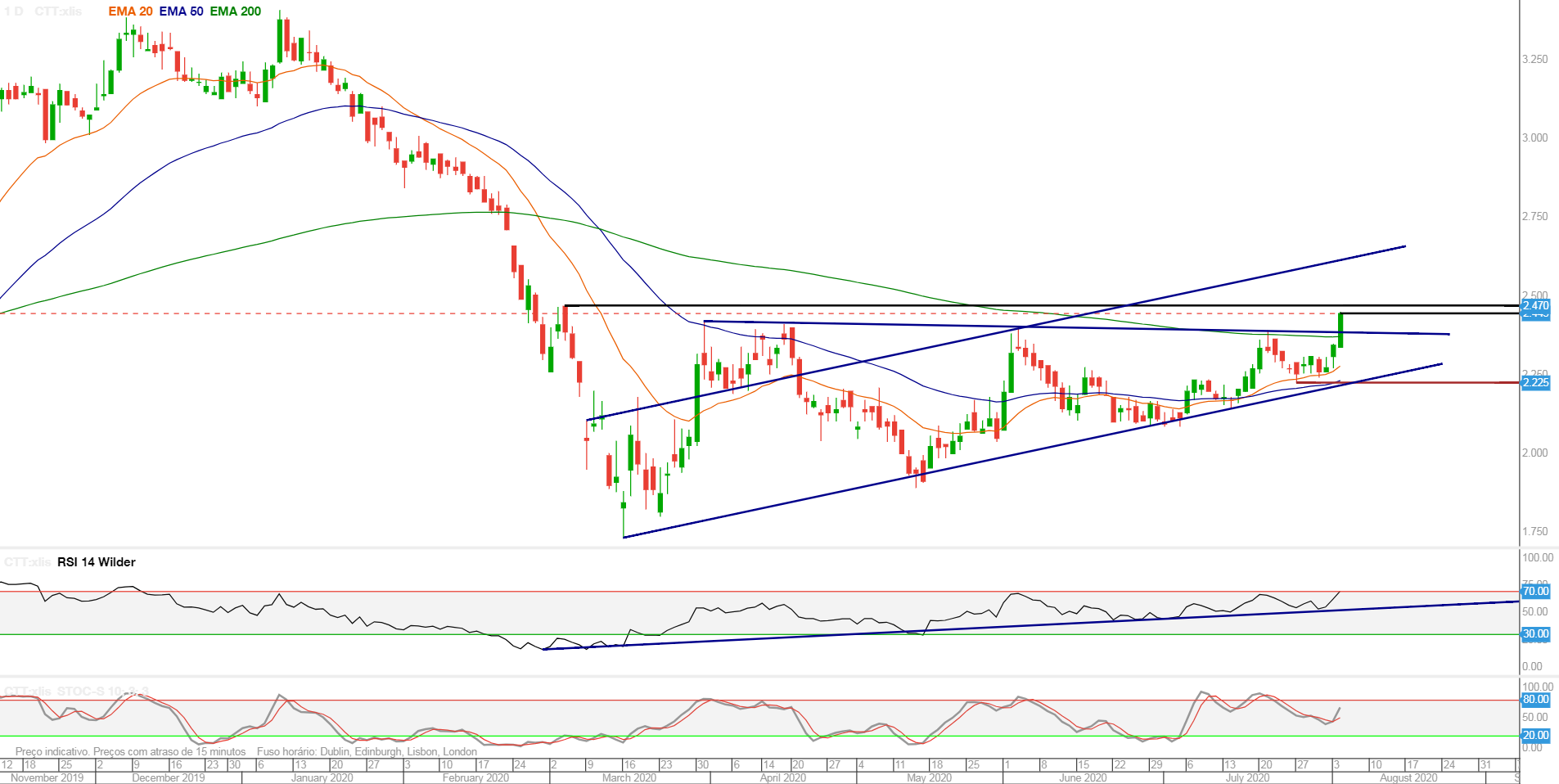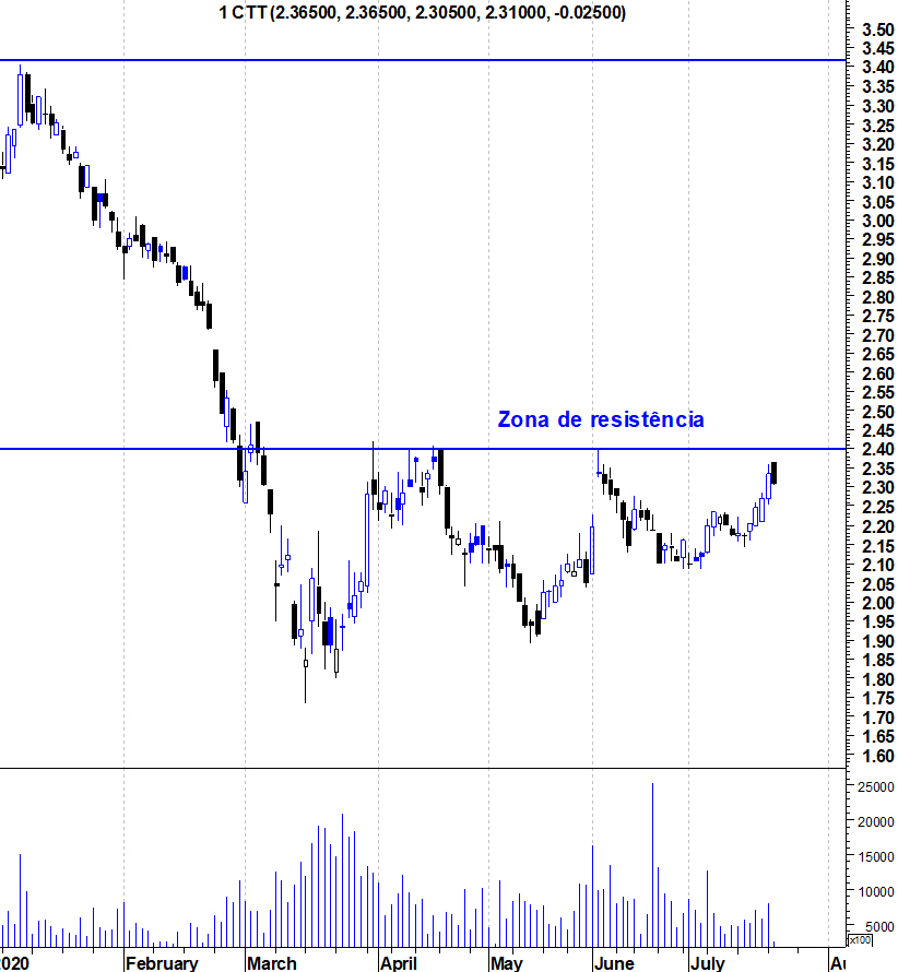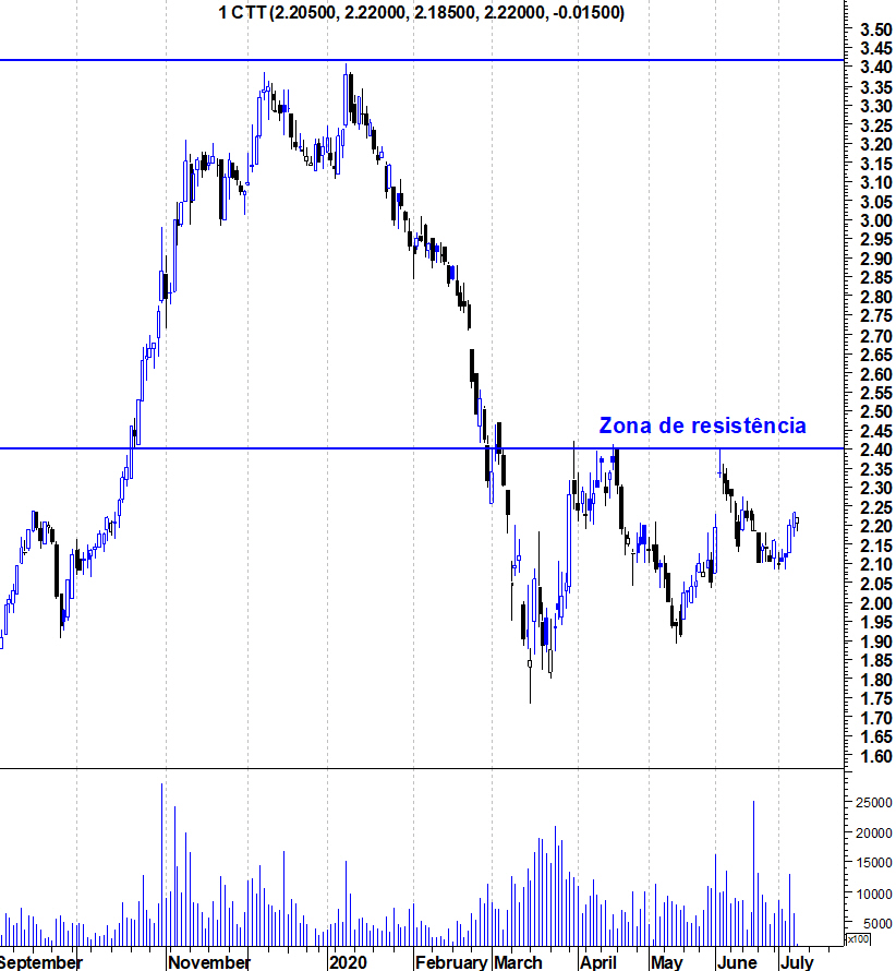Aqui deixo o gráfico actualizado dos CTT numa altura em que a acção está perto da sua importante resistência na zona dos 2,4 euros.