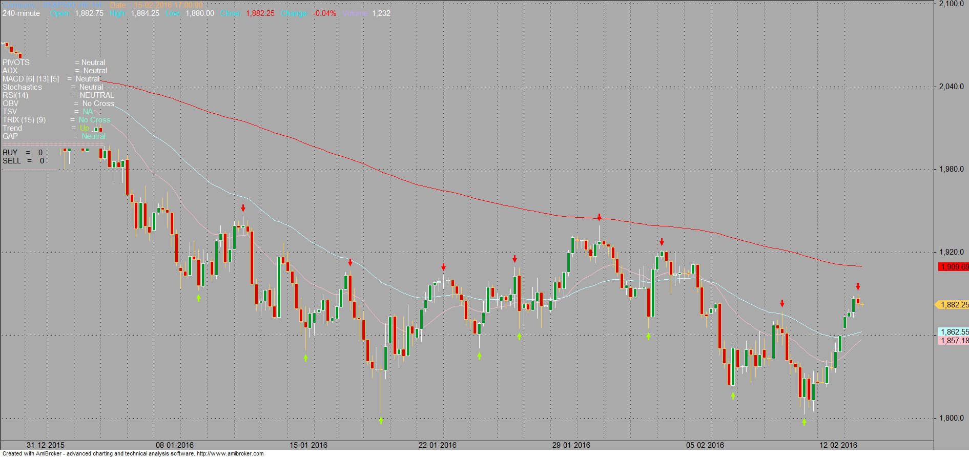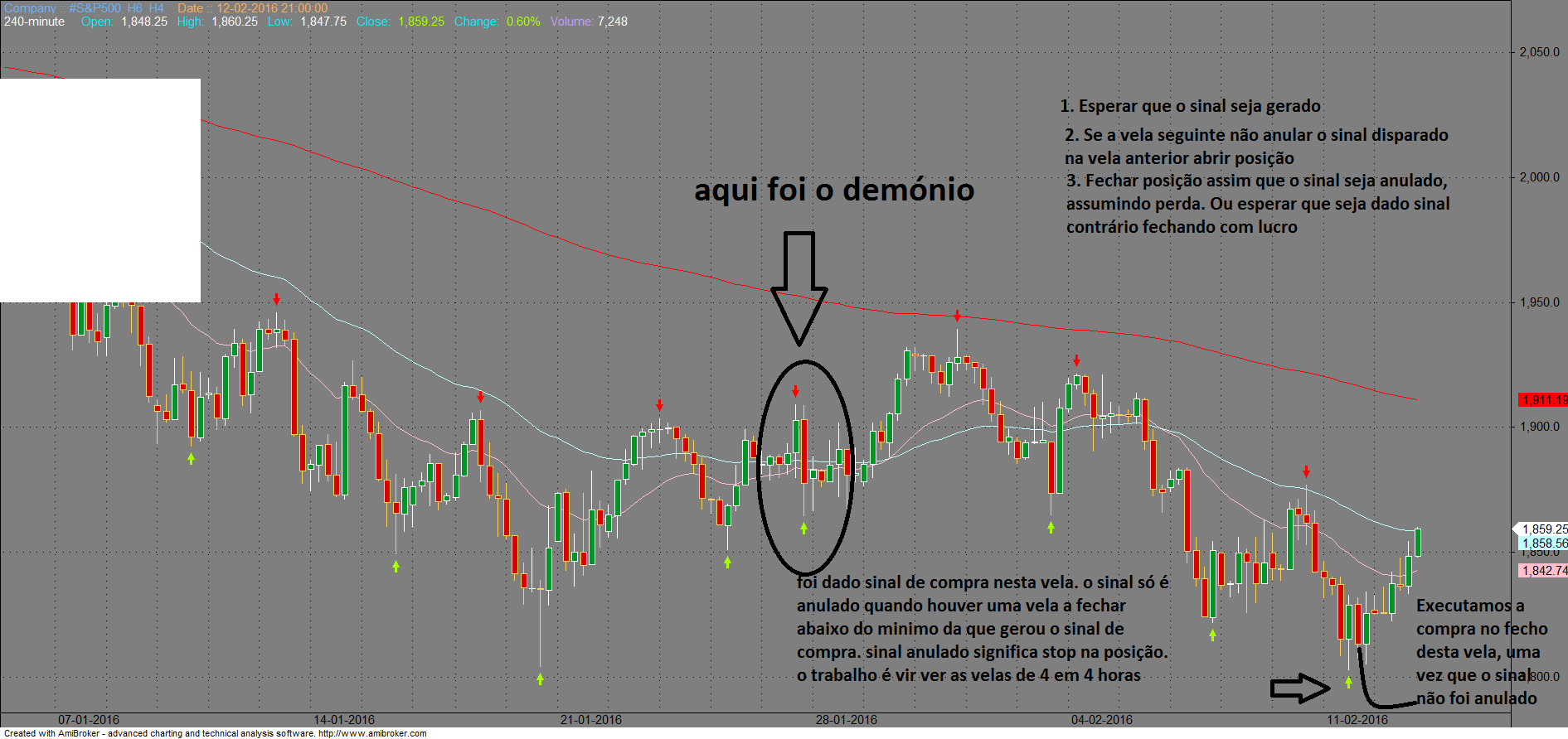 repara no que eu disse sobre o diário. apesar da seta de curtos aparecer no dia do doji (não significa que ela foi gerada naquele dia, mas sim com base nesta salgalhada de indicadores, entendeu que com base no que aconteceu naquele dia da seta dia 1 de fevereiro, ele mandou vender dia 5, pois foi o dia em que a setinha surgiu (apesar de ficar no dia 1). Ou seja no dia 5 fechavas os longos e no dia 6 como o sinal de curto se mantinha entravas curto, que os mandou fechar quinta no fecho, com o sinal de longo. ontem como o sinal de longo se manteve abrir longos no fecho. até que gere novo sinal de curtos e fechasse a posição ou desapareça o sinal de longos gerado na quinta e um gajo fecha com perdas